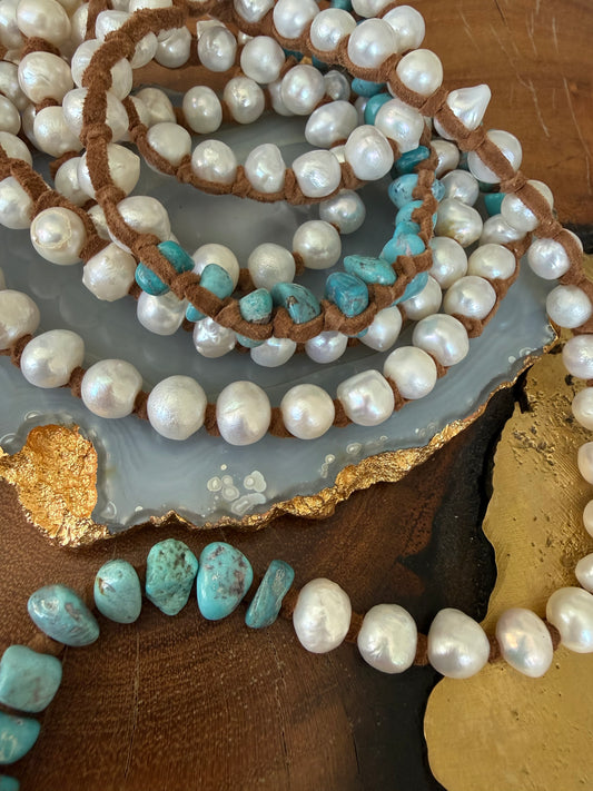 Tess Sm White Pearl and Turq XLong Necklace