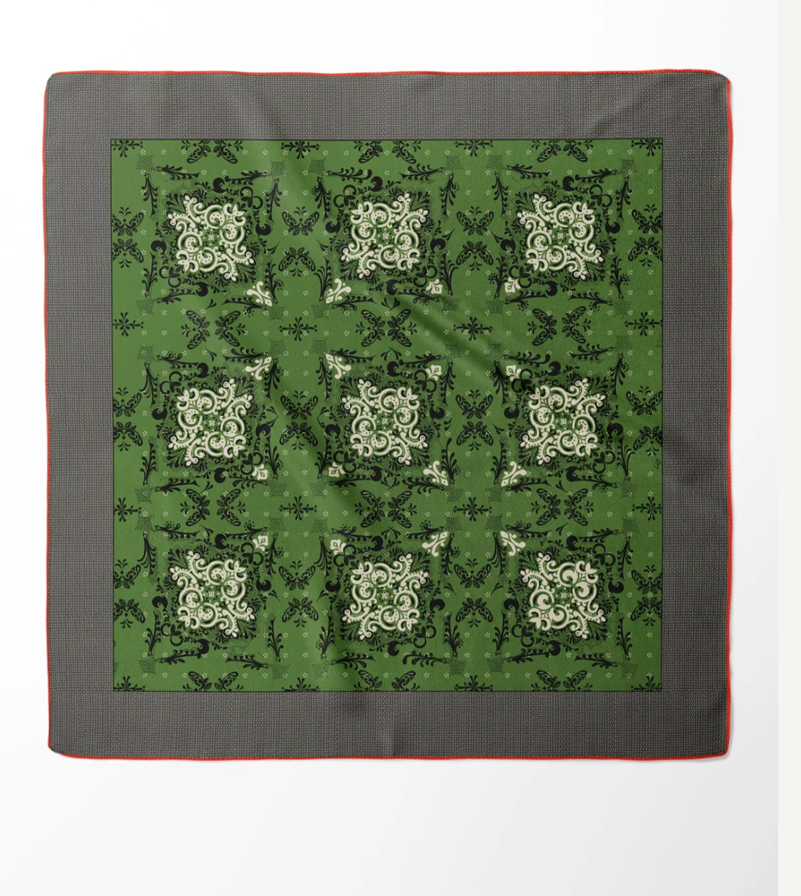 With its asymmetrical flourishes and curving motifs, the Rococo Bandana blends the grandeur of European ornamentation with the rebellious independence of the American West. The silk twill drapes effortlessly, the hand-rolled edges whisper craftsmanship, and the oversized format allows for endless styling possibilities.
