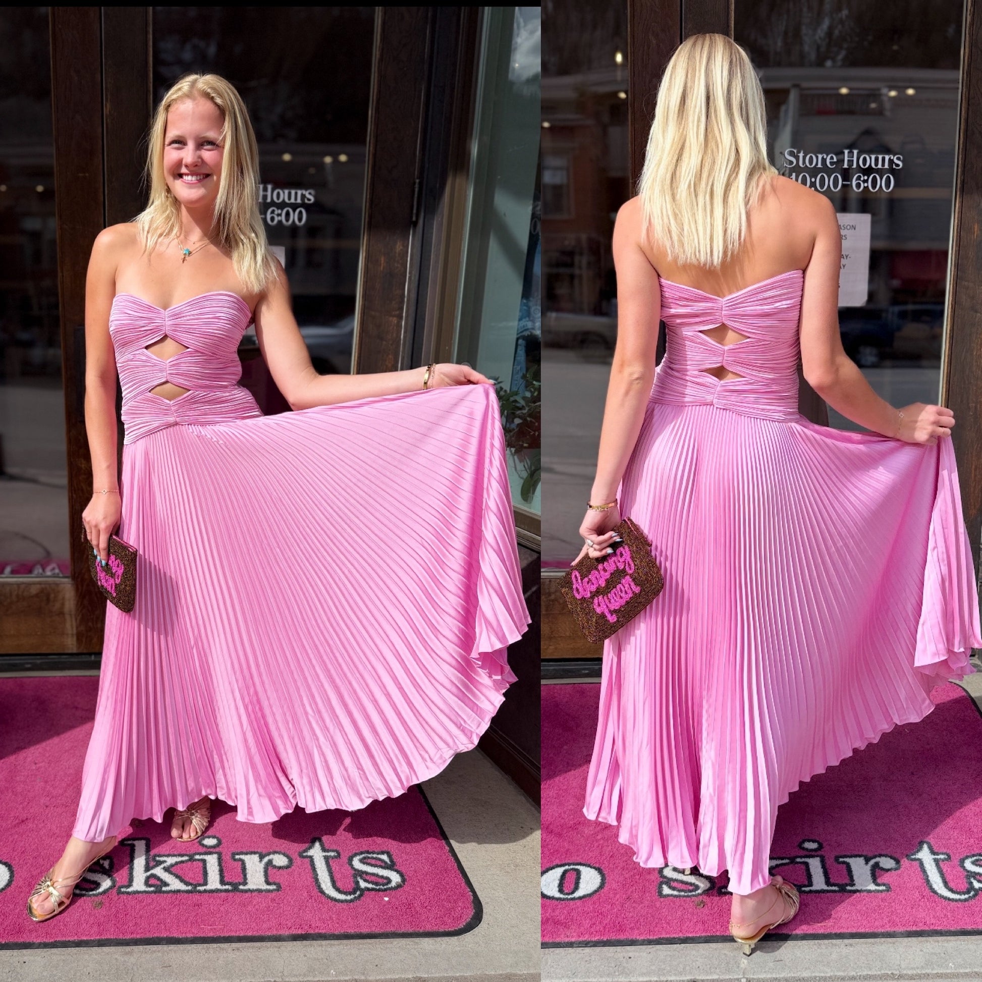 The Carolynn Dress features a micro-pleated bodice with sculpted contour under the bust and a pair of diamond cut-outs that frame and flatter. Finished with a sunburst-pleated A-line skirt.