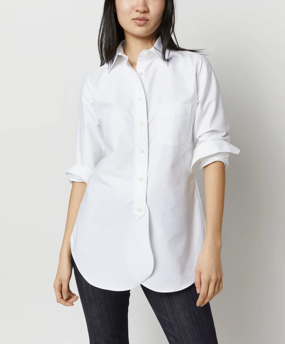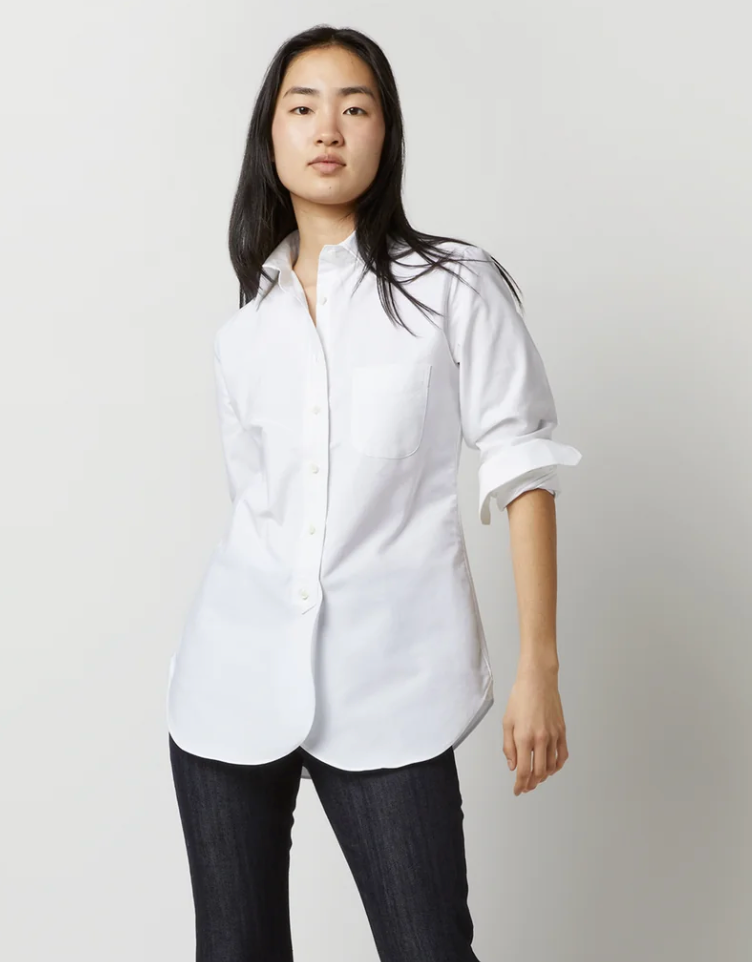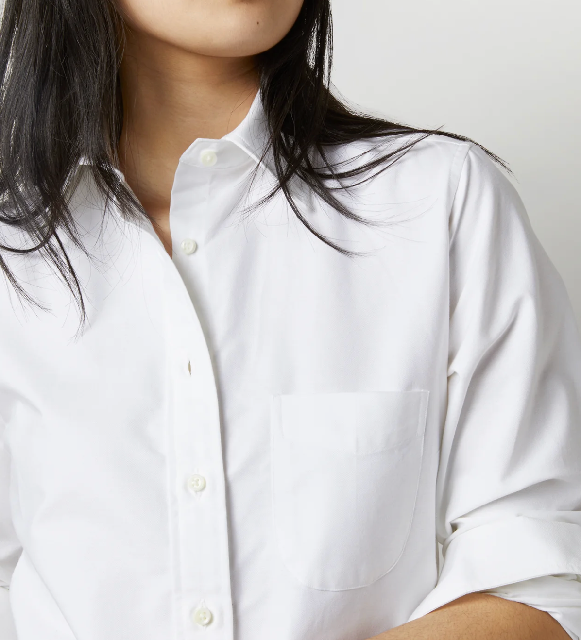 The Boyfriend shape is everything you love about a man's shirt, cut slimmer to flatter a woman. It has a slightly oversized collar and cuffs, longer tail and front pocket for receipts, bobby pins, or an emergency breath mint. Tuck it in or don't — we love it worn out with the hem out over trousers, jeans of all kinds, short skirts, or cutoff shorts. This one's made up in a classic white oxford cloth sourced from Portugal that looks even better with a bit of a rumple to it. It's great.
