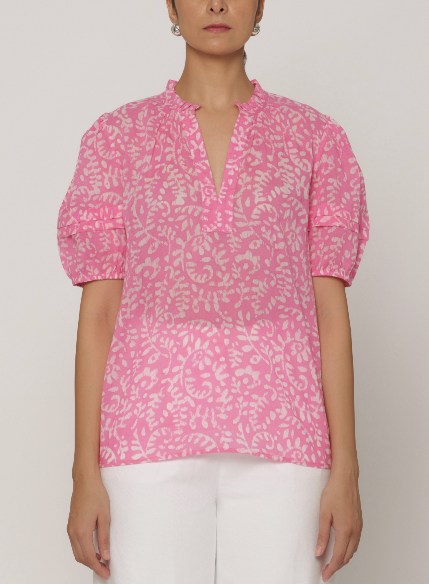 The Bronte top is an easy-wearing pullover with a front opening and delicate detailing at the neck. Finished with charming pleats on the sleeves, this top balances comfort and style.