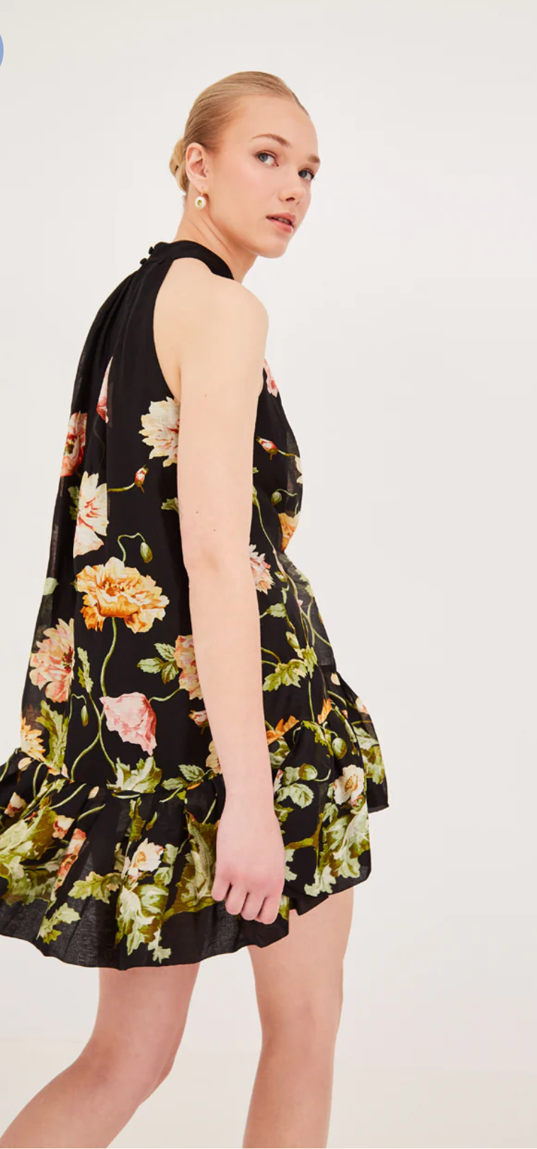 • Mock-neck halter printed mini dress with a high-low hem and ruffled bottom tier