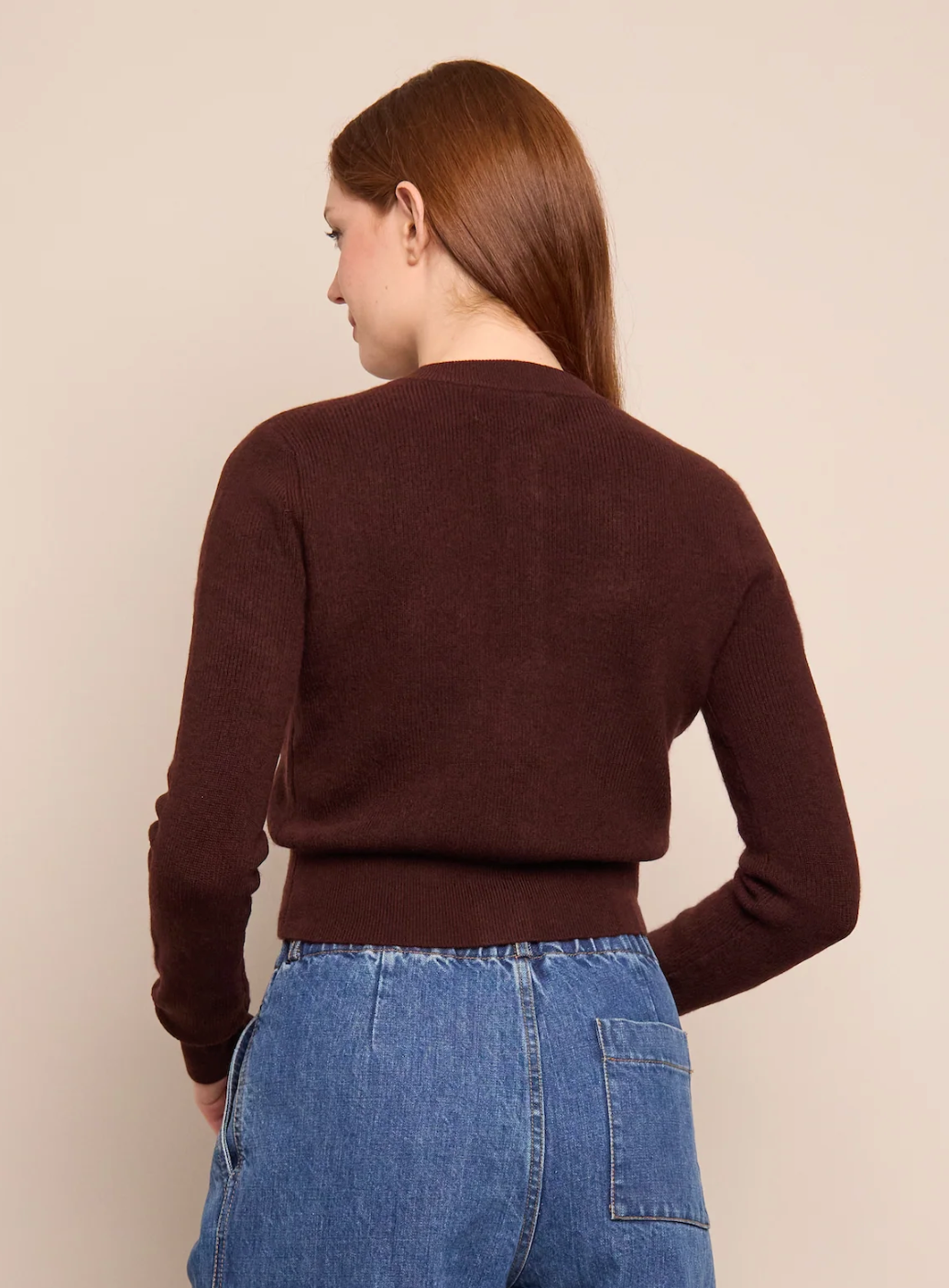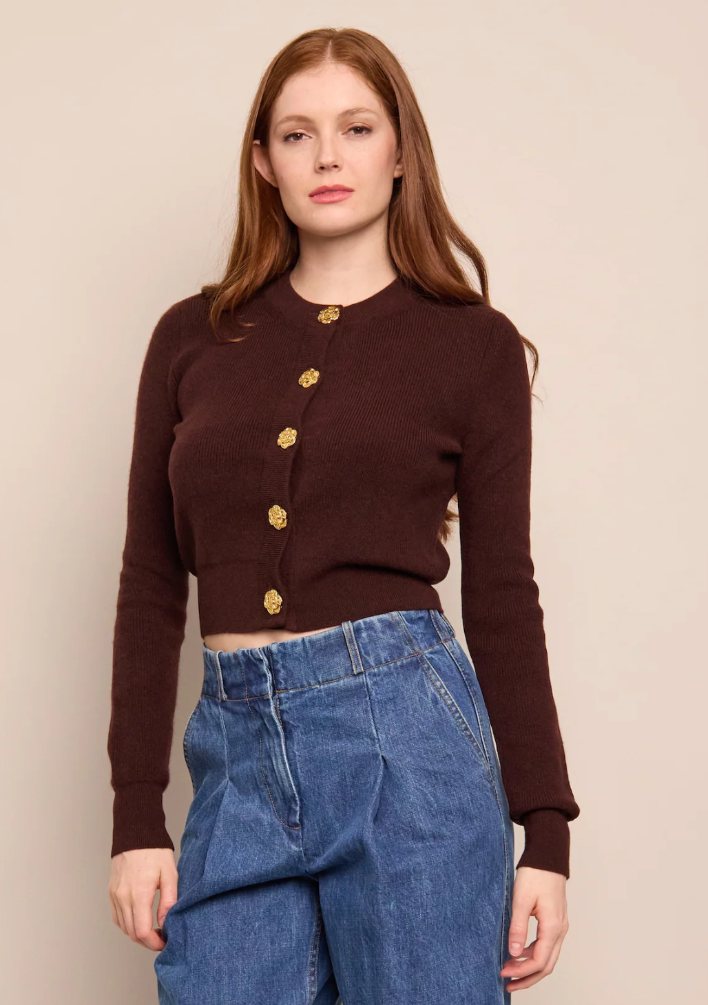 Crewneck fitted long-sleeve cardigan with novelty gold floral buttons