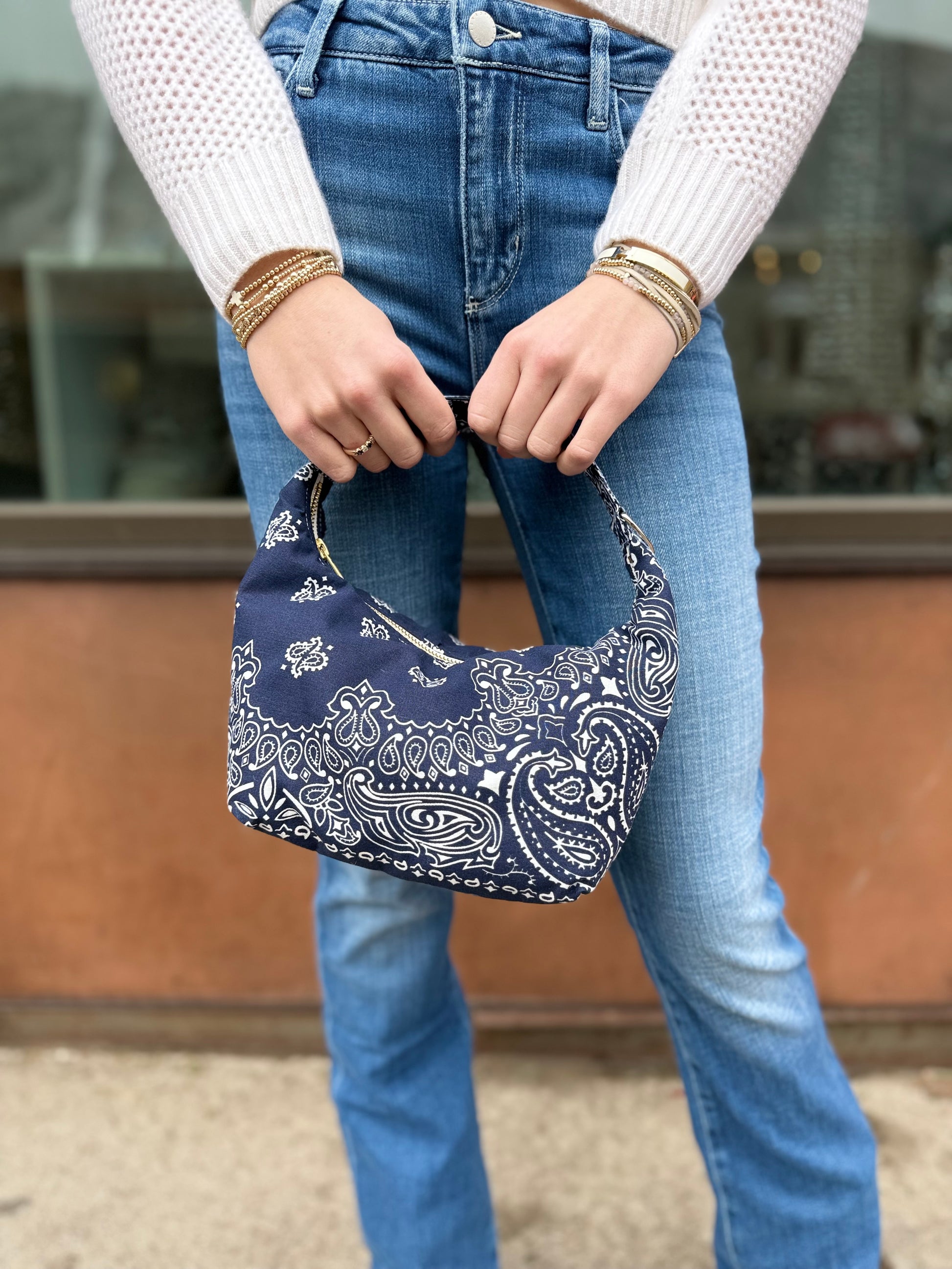 Adjustable handle with 2 snaps. 1 half-moon ring on the handle to add a lucky charm. Zipper closure. Bandana lining. Composition: 100% cotton. Dimensions: H 17 x W 30 cm / 6,7 x 11,8 in. Dimensions of the handle strap: L 22 cm x W 5 cm / 8,6 x 1,9 in. Bandanas made in the USA. Bag made in Europe. Care: Hand wash 30 degrees without soaking. No machine drying, prefer to dry flat in the open air. Our bandanas are handcrafted. Dye baths may vary slightly from one production to another.