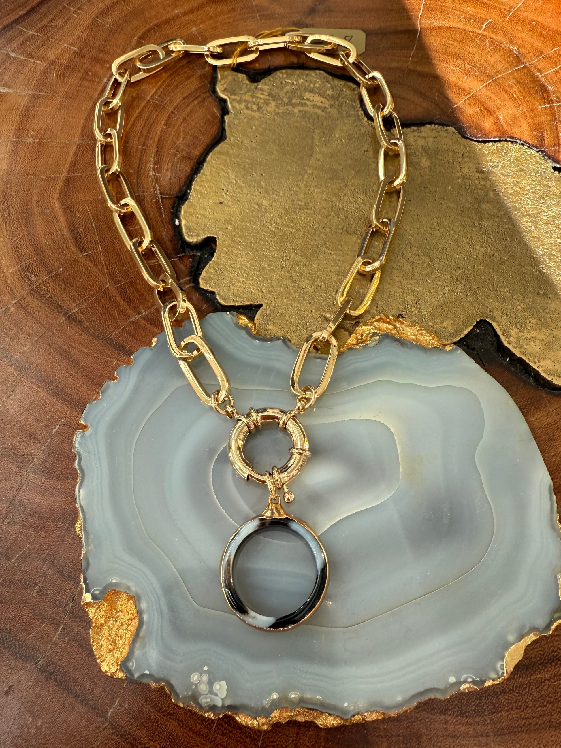 14K Gold filled large paperclip link chain with lifesaver clasp and black O circle charm.