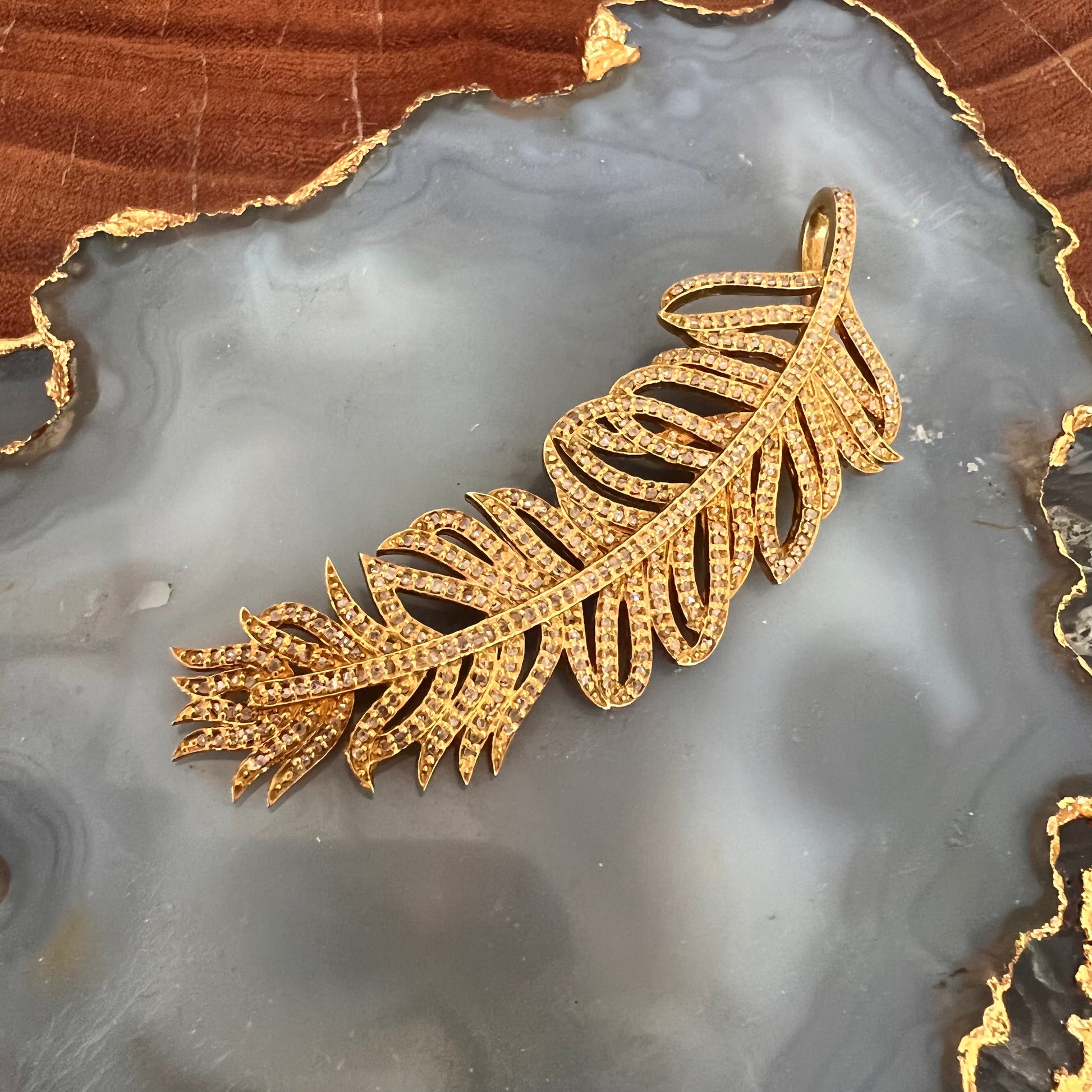 Evergreen hand made jewelry. Gold arched feather charm with pave diamonds. Necklace sold separately.