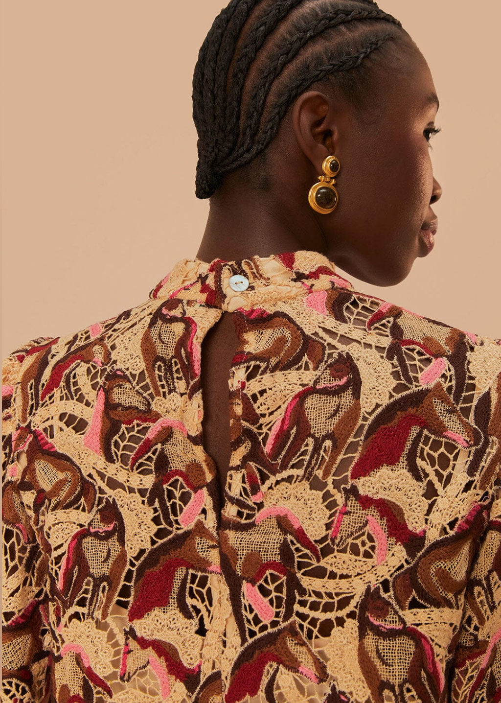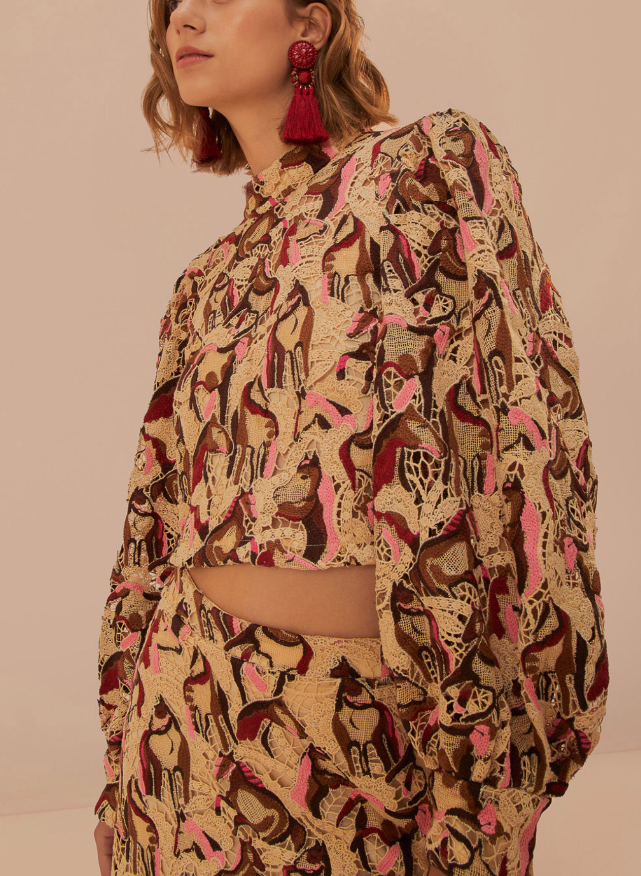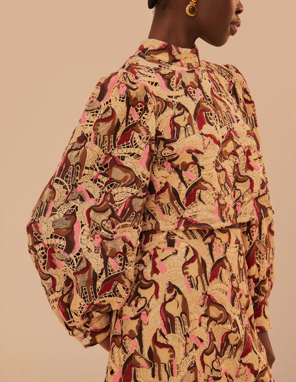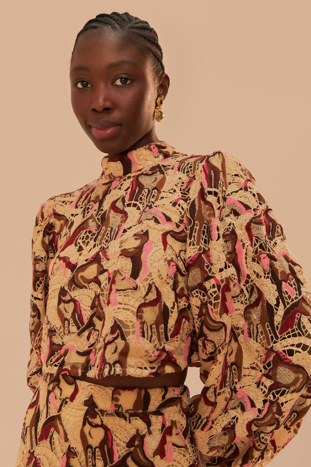 Embrace elegance with the Cream Horses Guipure Blouse, a unique piece that features a high neckline and an intricate horse-patterned guipure lace. Its cream backdrop is adorned with rich brown and soft pink hues, creating a visual feast that accentuates the whimsical design. The blouse's subtle yet sophisticated silhouette is gently tailored, offering a touch of refinement to any outfit.