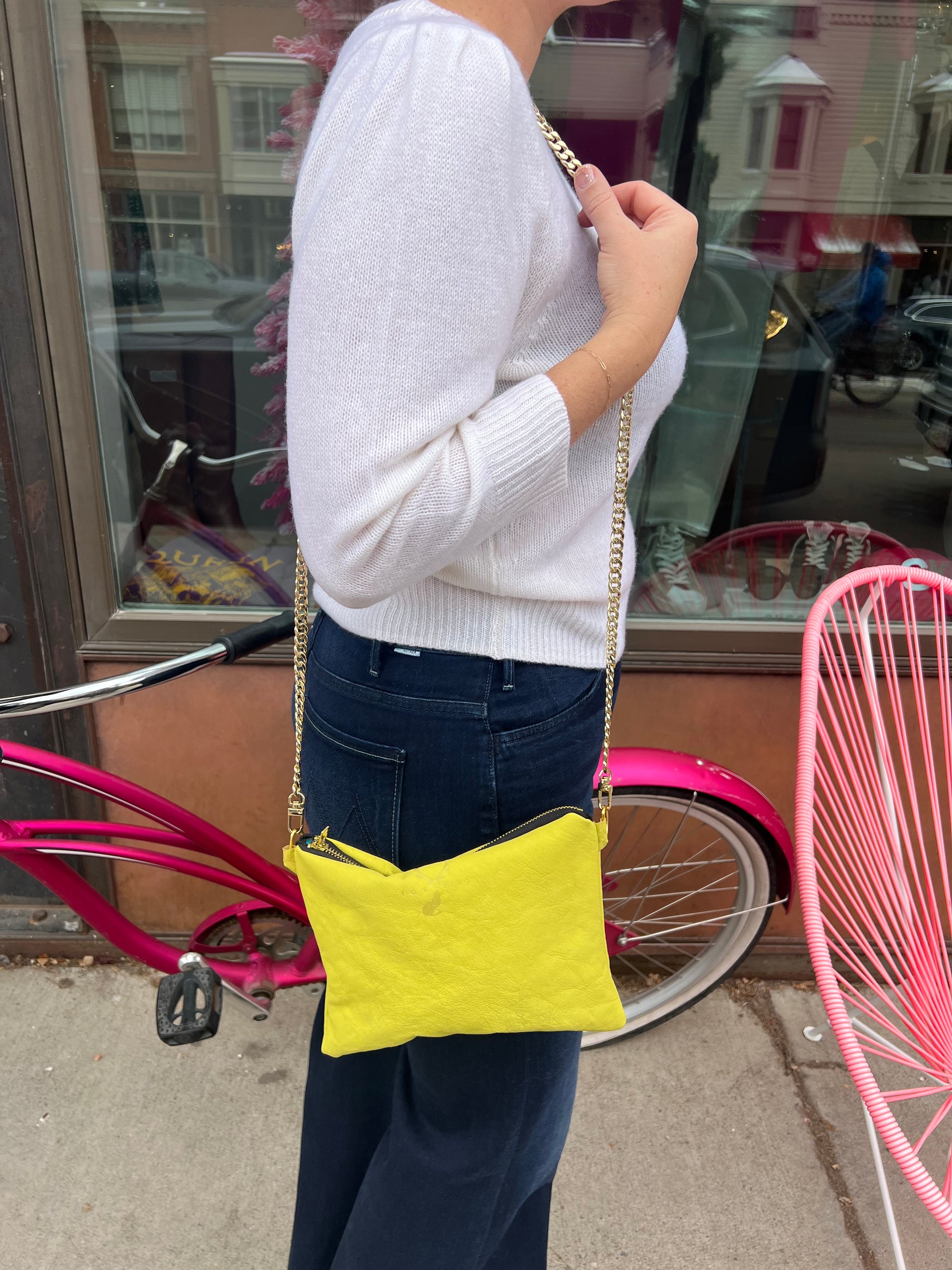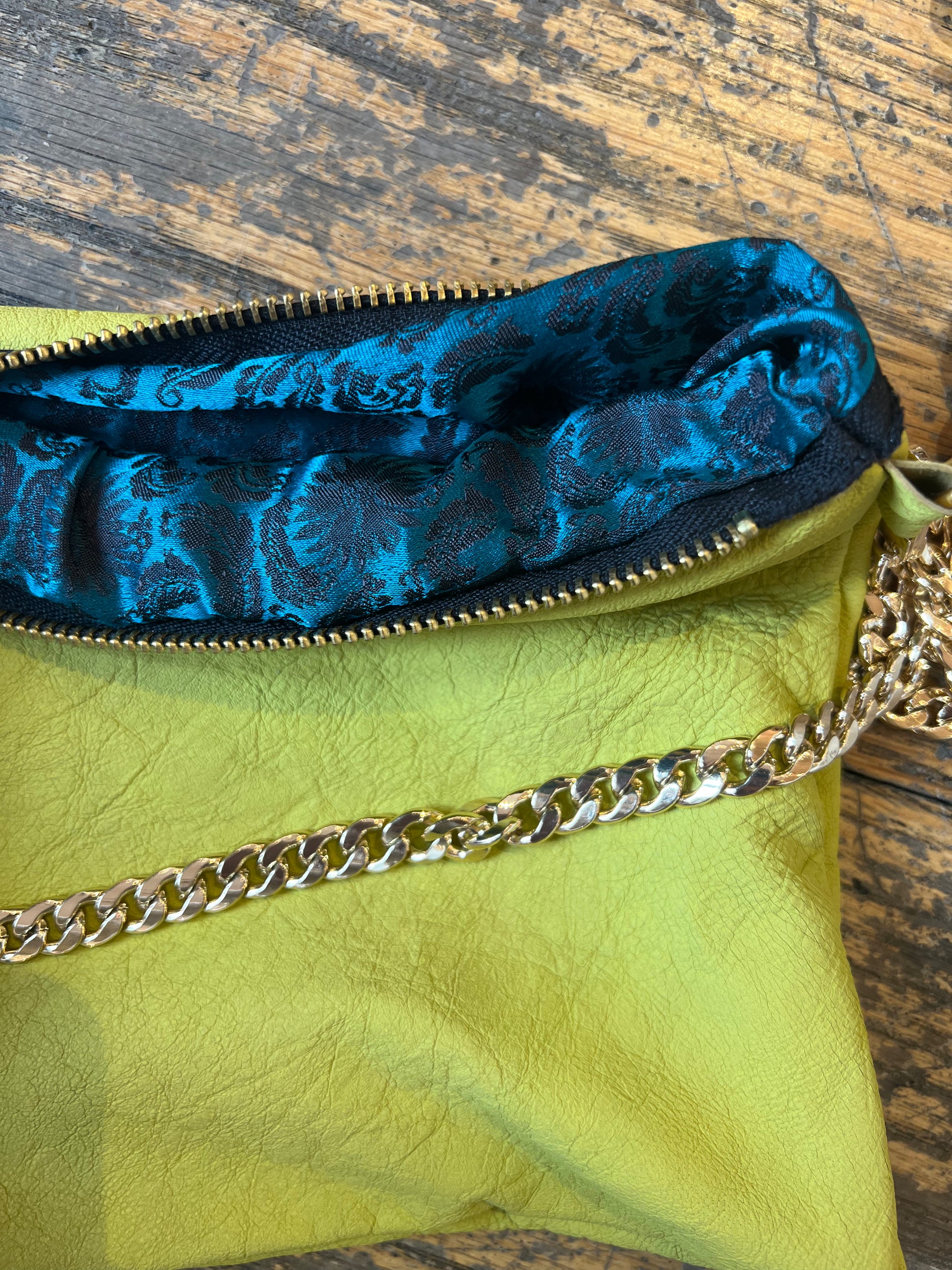 Telluride locally made clutch with hand sewn fabric on inside and removable chain.