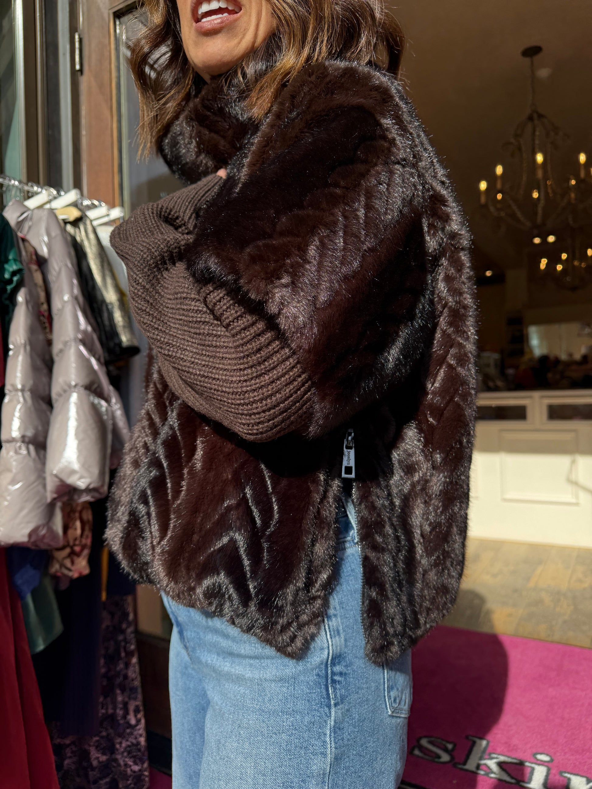 Sleek and sophisticated, this chocolate faux fur pullover sweatshirt is one of our standouts this season. Featuring a faux fur cable stitch with knitted sleeves.