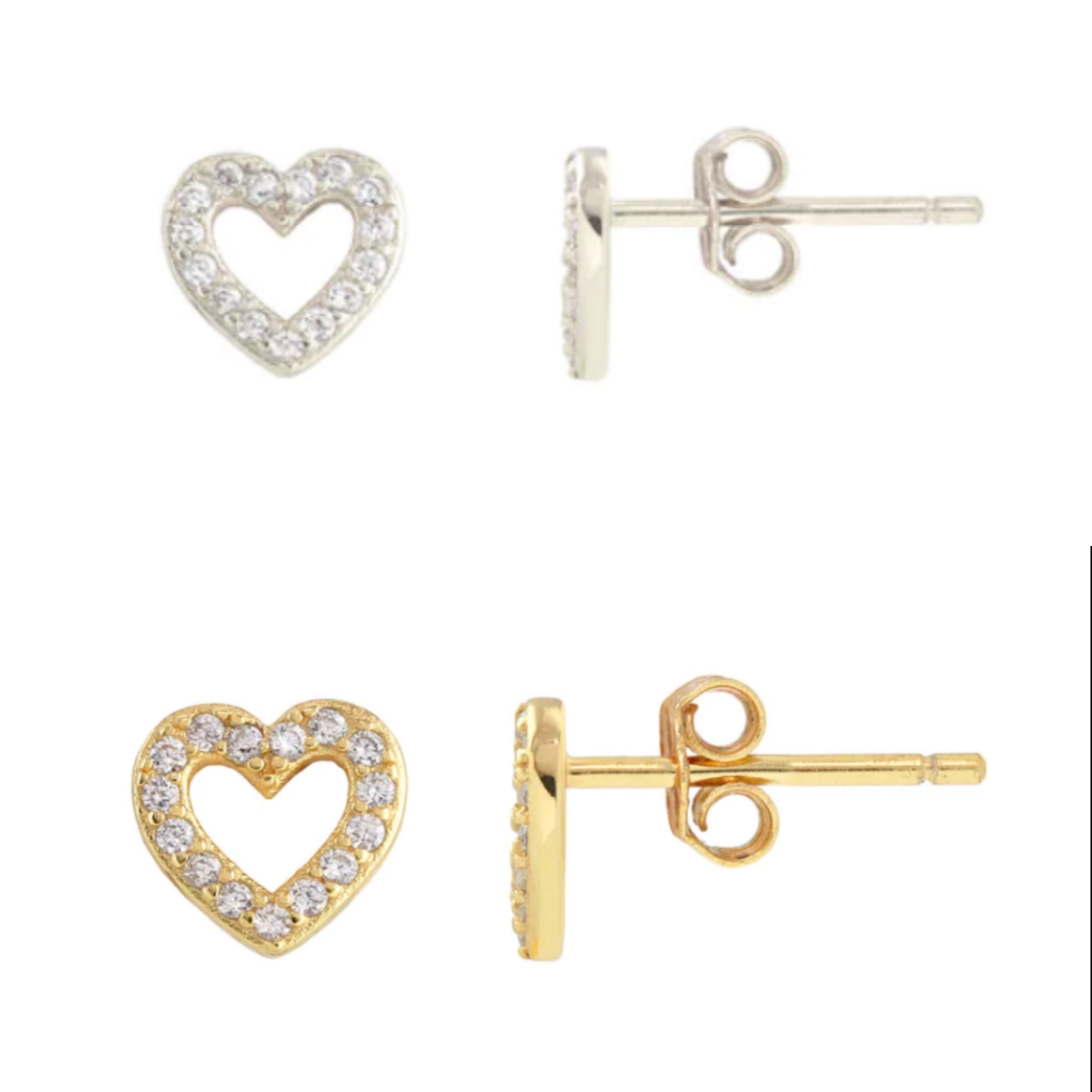 Heart outline stud earrings measure 7mm wide. Available in 18K gold vermeil or pave crystal 18k gold vermeil.