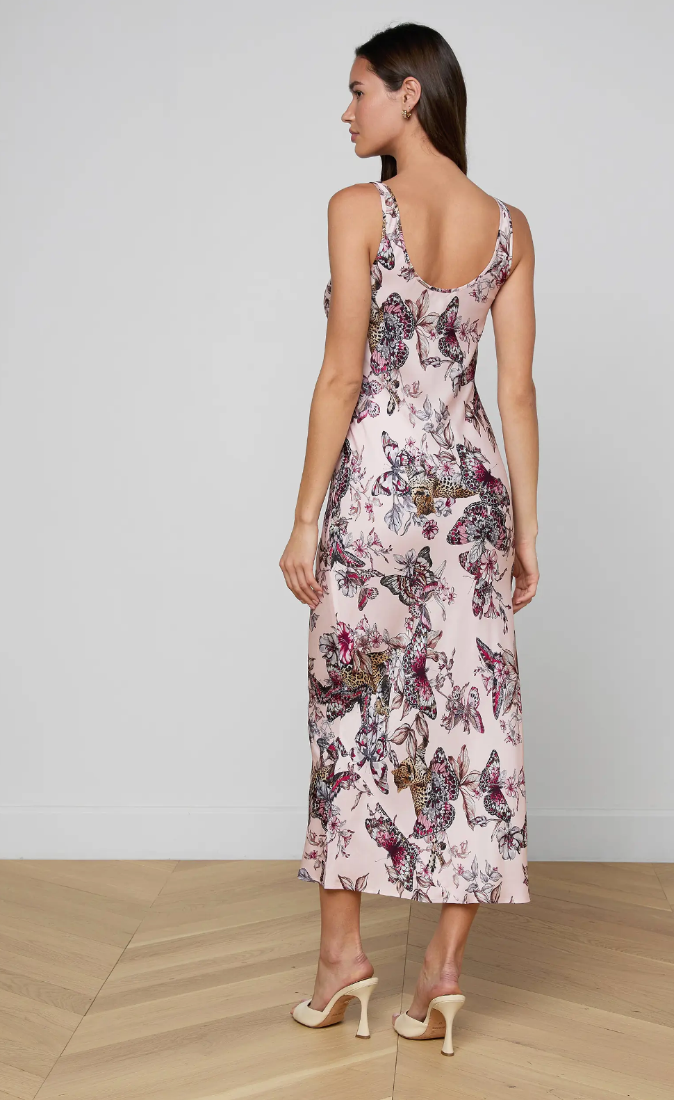 Minimal, elegant, and flattering, the Akiya dress is an evening essential. Lustrous, bias-cut satin drapes beautifully over the figure. Now back in light pink with a butterfly jungle print.