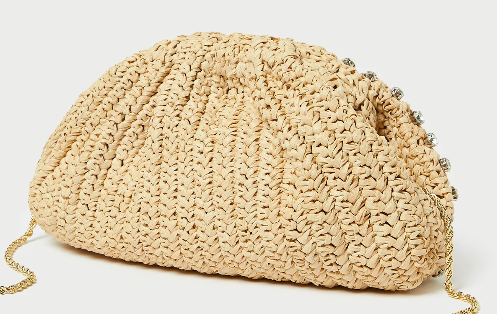 Dome-shaped frame pouch in natural crocheted raffia with rhinestone embellishment. Features a removable twisted gold metal shoulder strap, frame closure, full lining, and interior card slot.