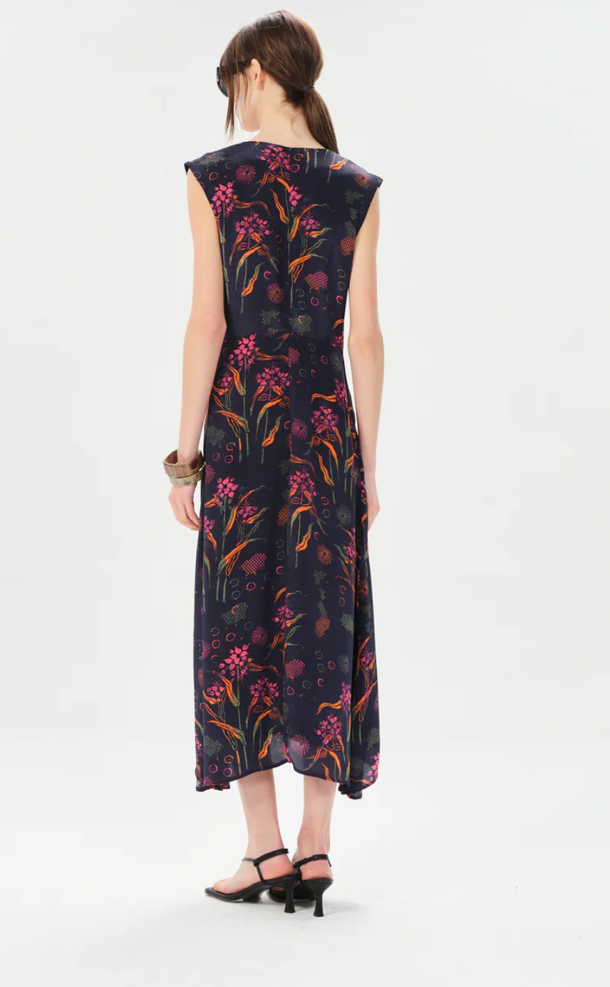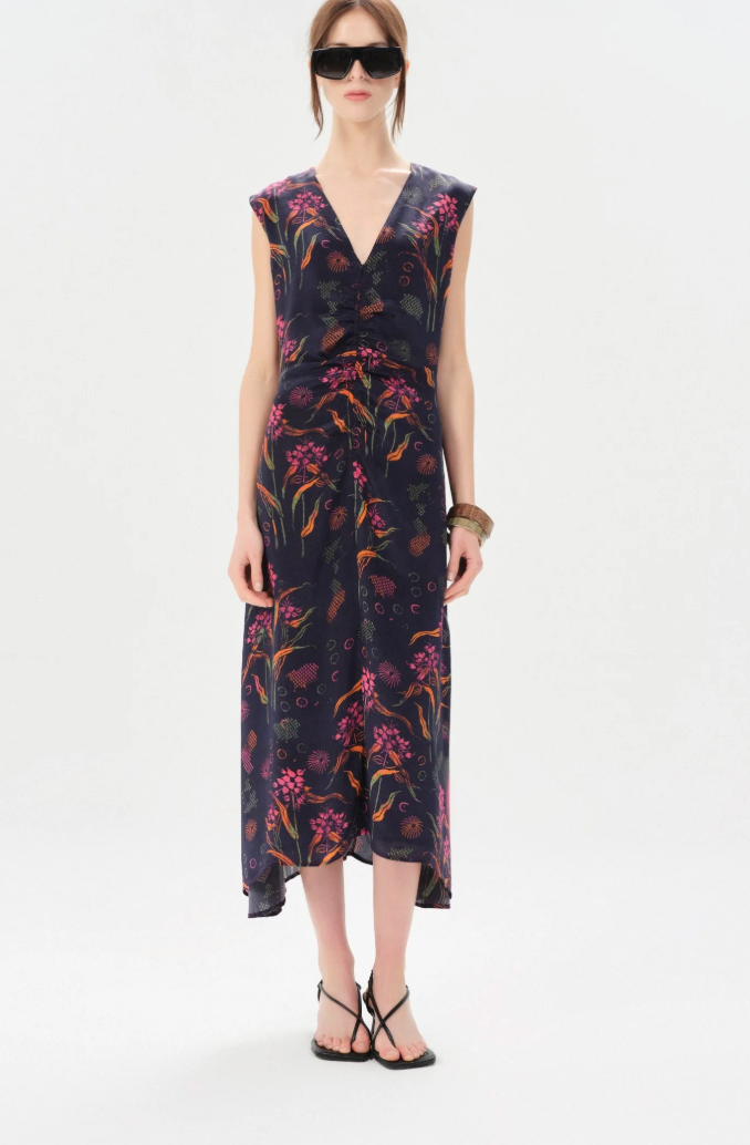 Crafted from natural crepe, this dress features a fluid silhouette with a deep V-neckline and cap sleeves. The asymmetrical hem and intricate floral print add a refined yet effortless touch.