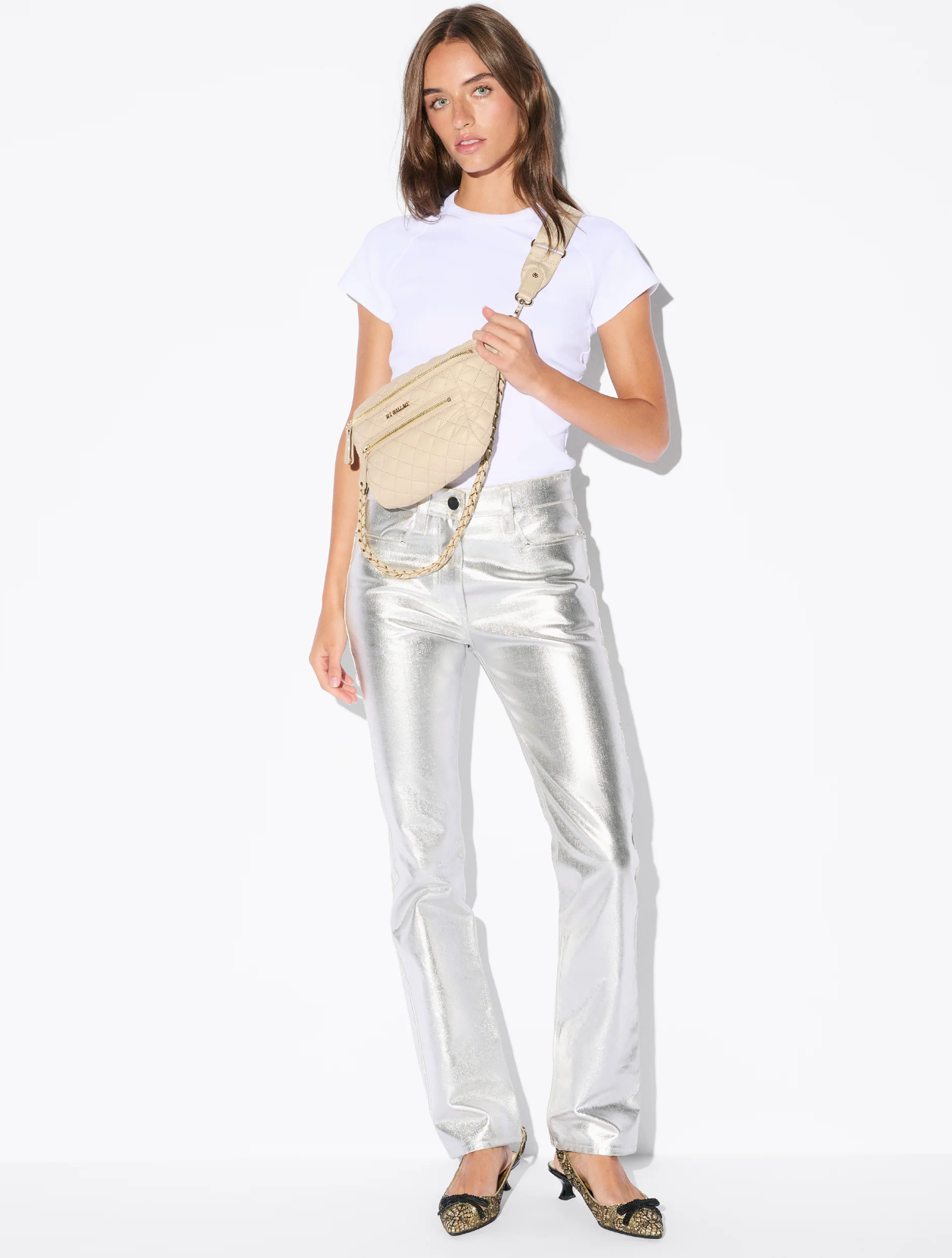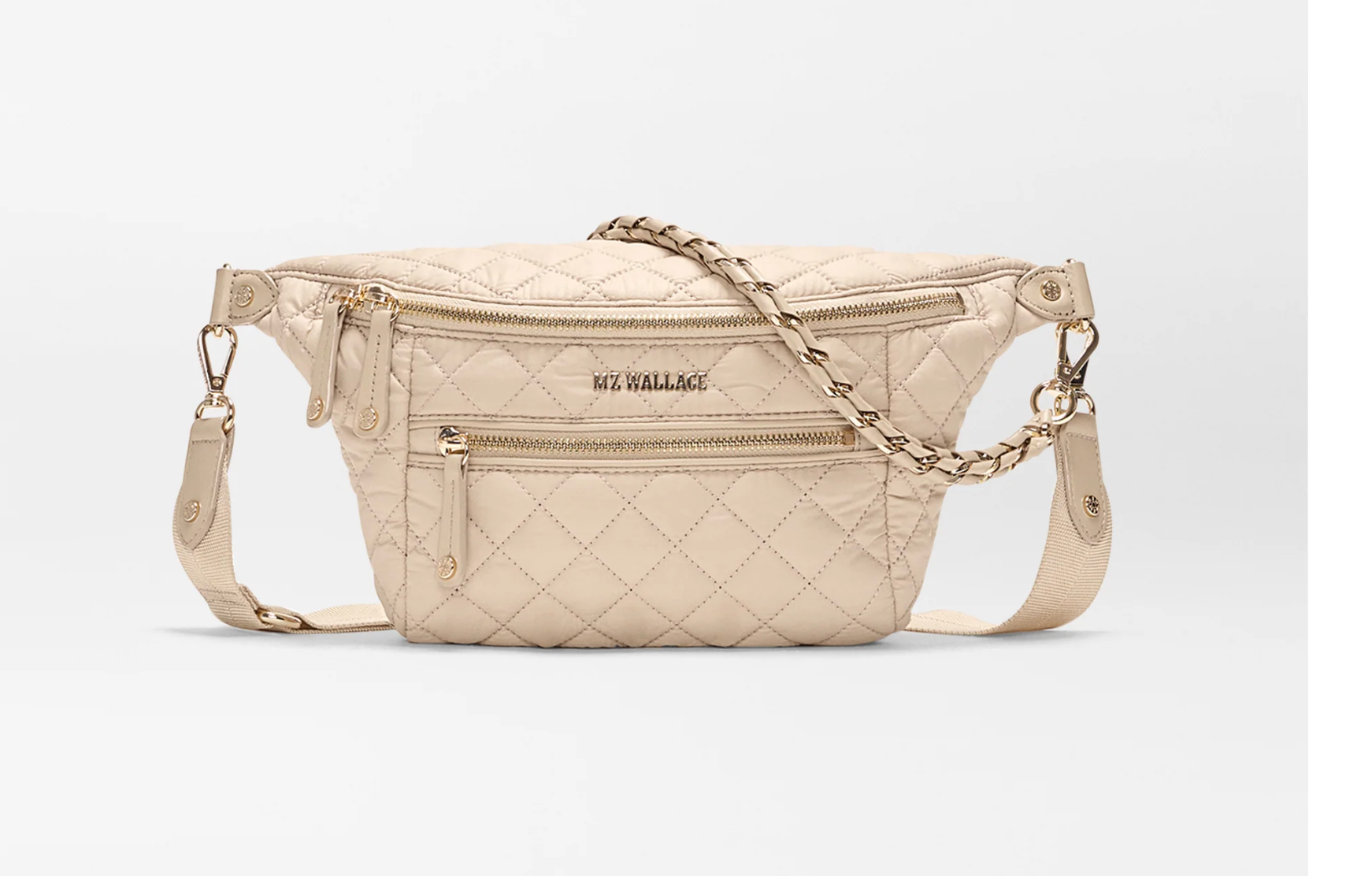 - Hardware: Light gold hardware