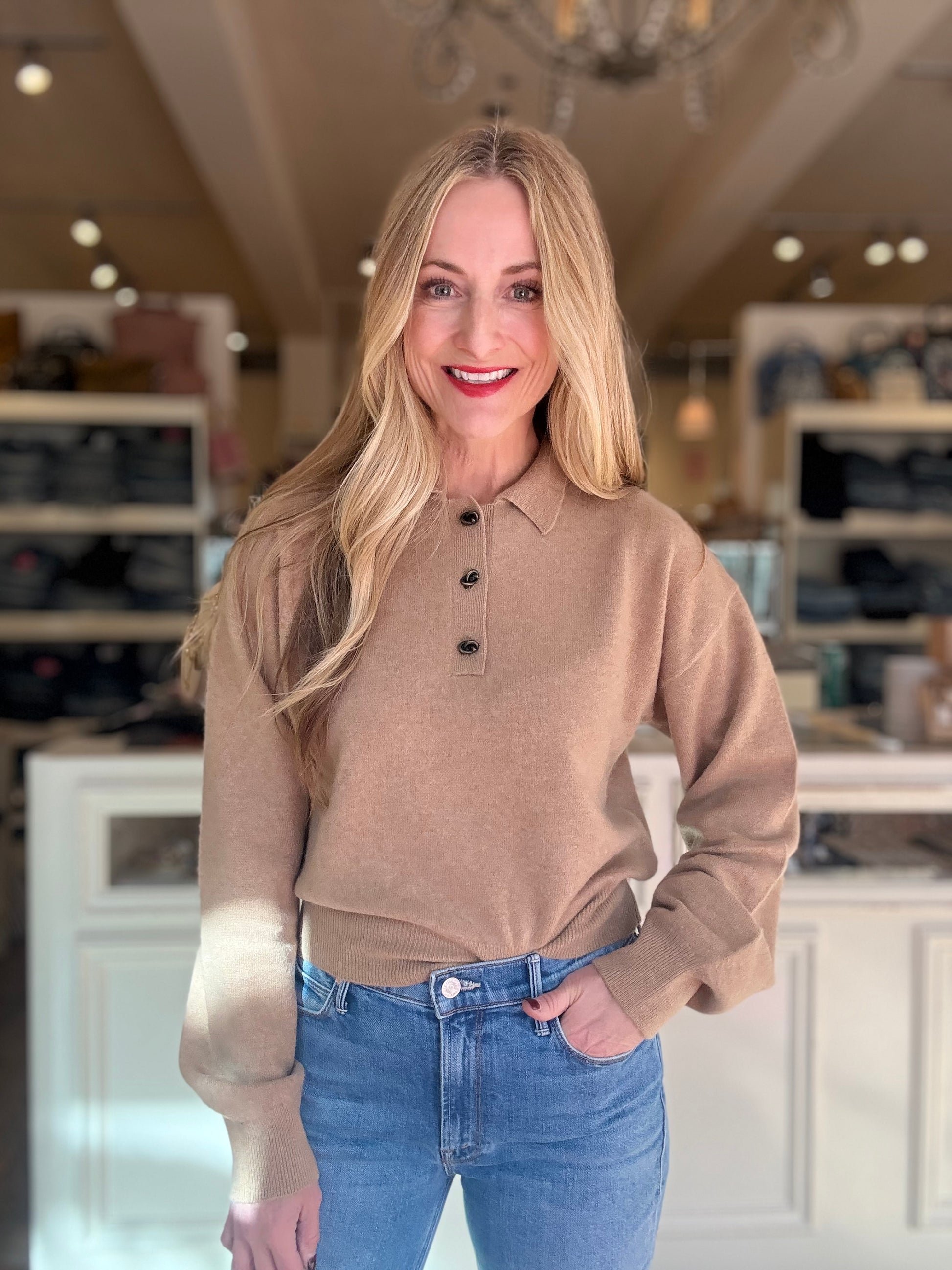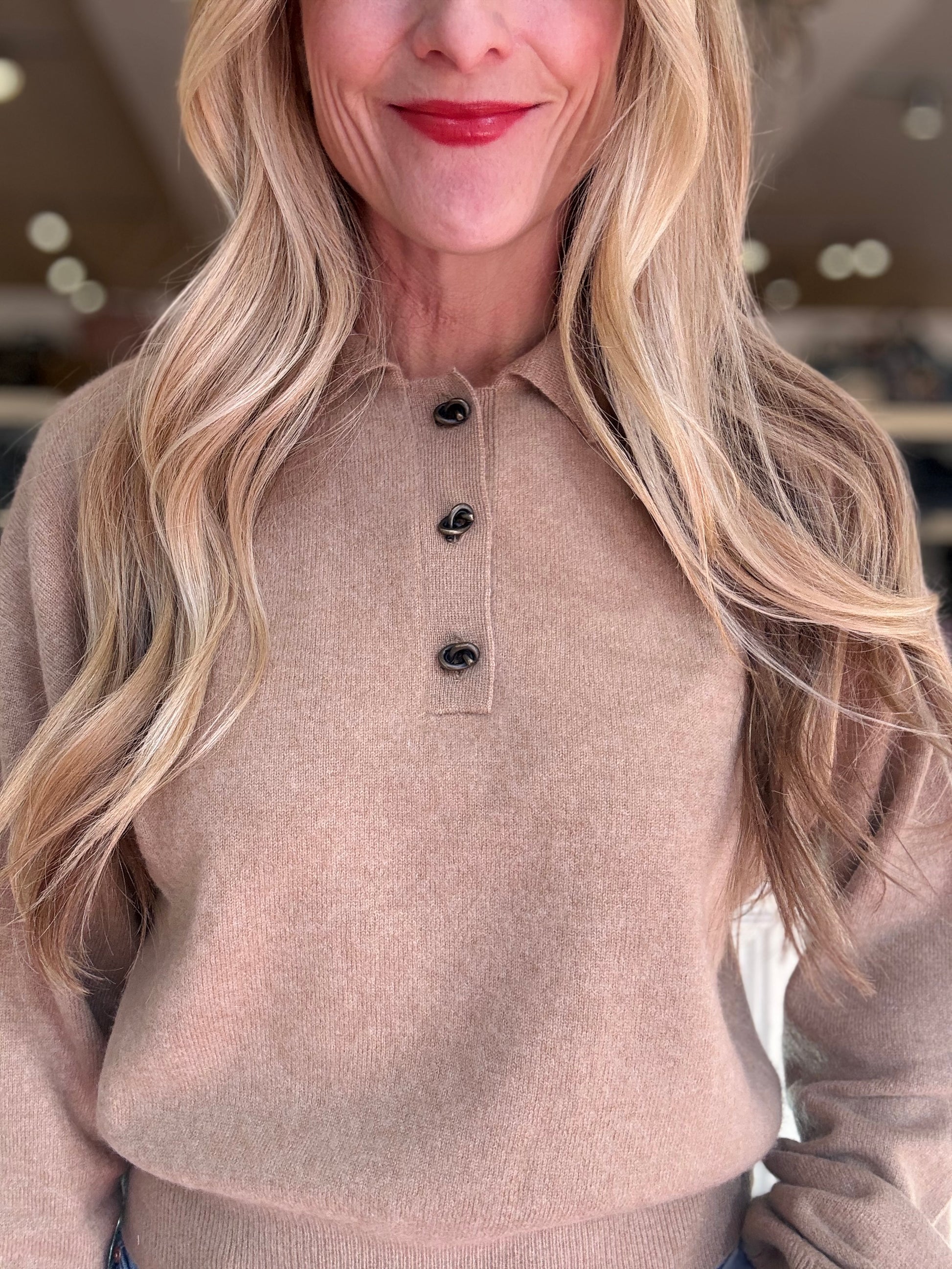 Cashmere long sleeve polo with novelty metal knot buttons.