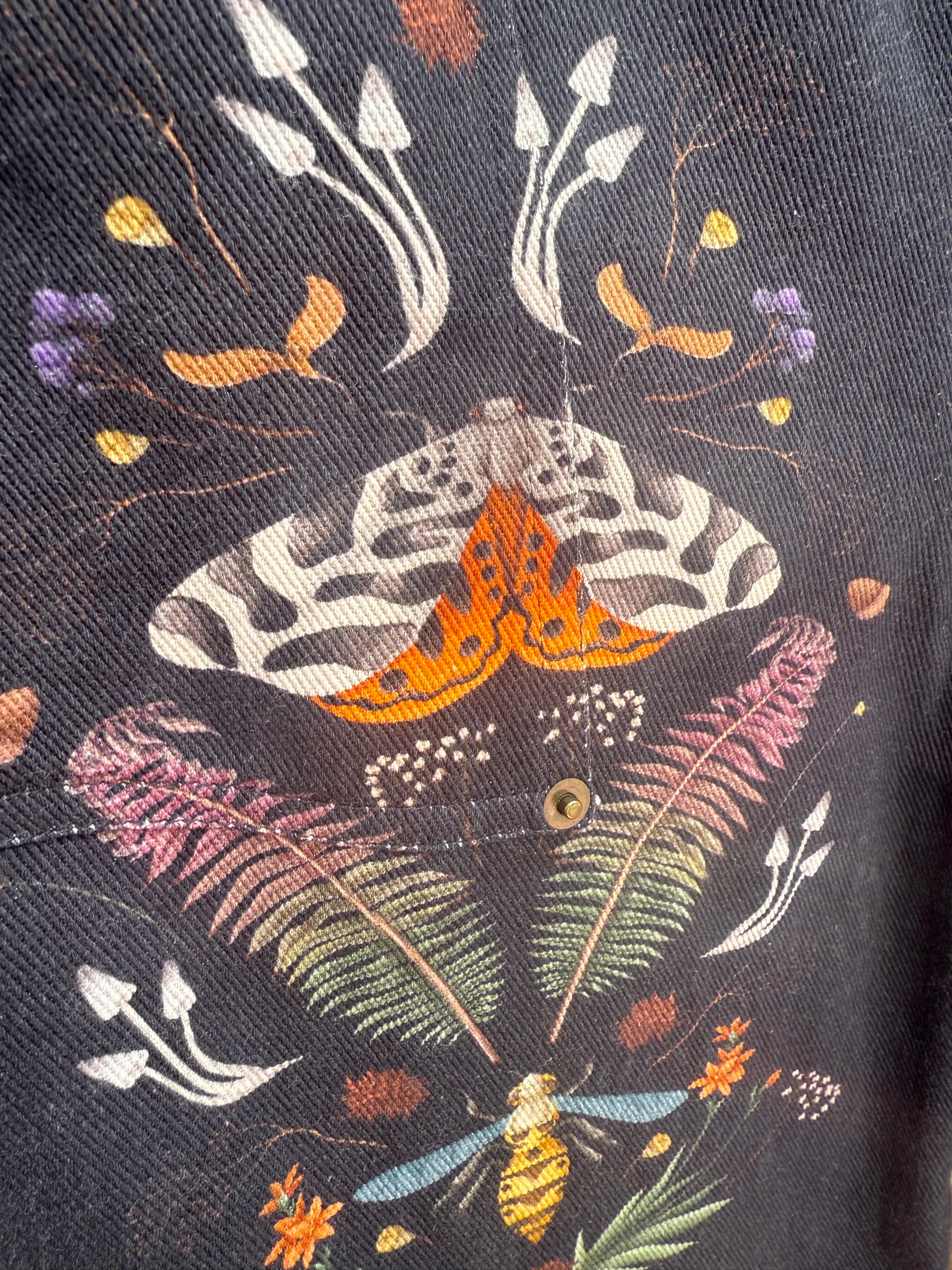 Wide crop light weight denim pants with painted whimsical garden bug painted print.