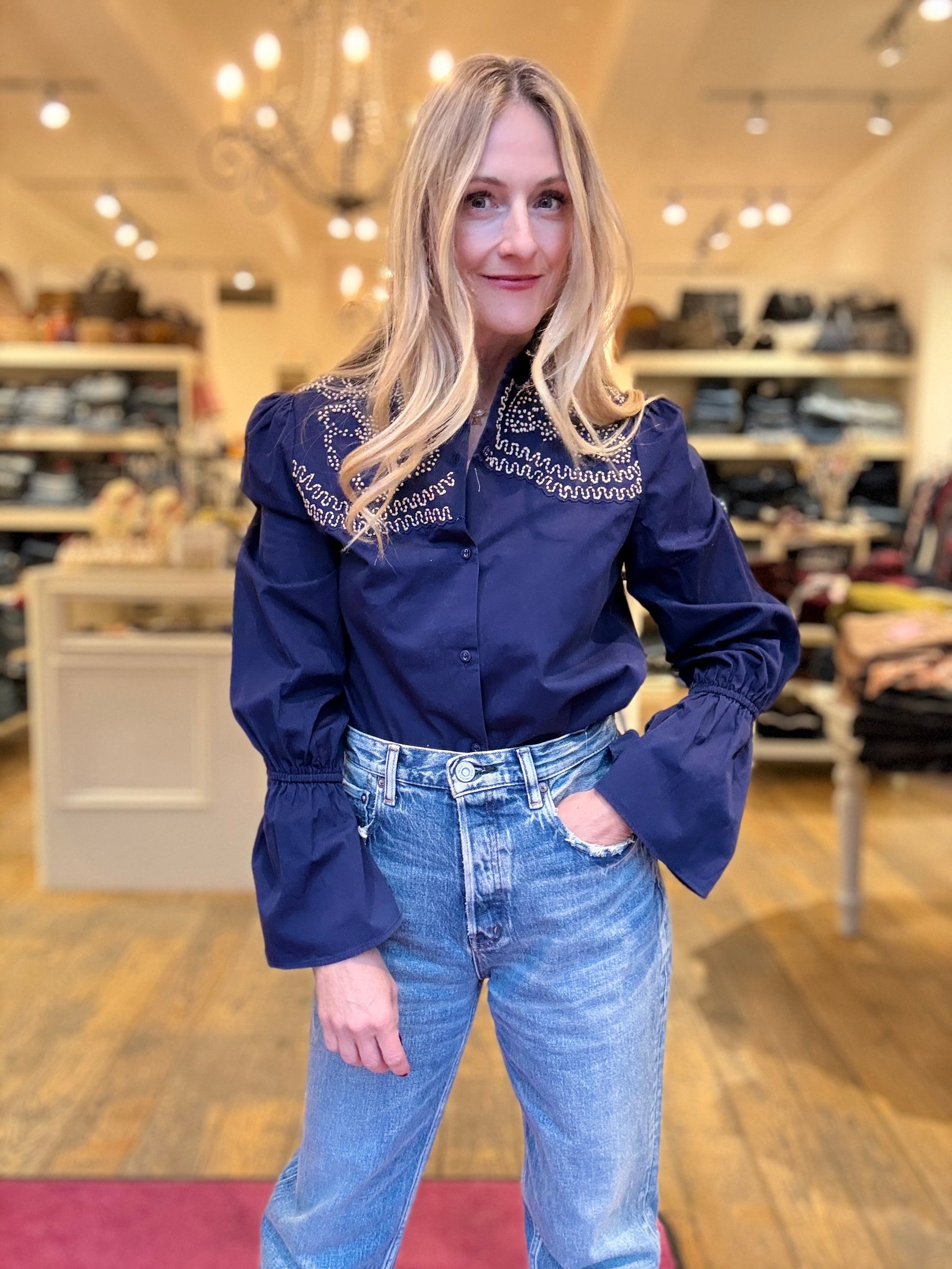 Navy cotton poplin shirt with flared cuffs and tan French knot floral pattern.