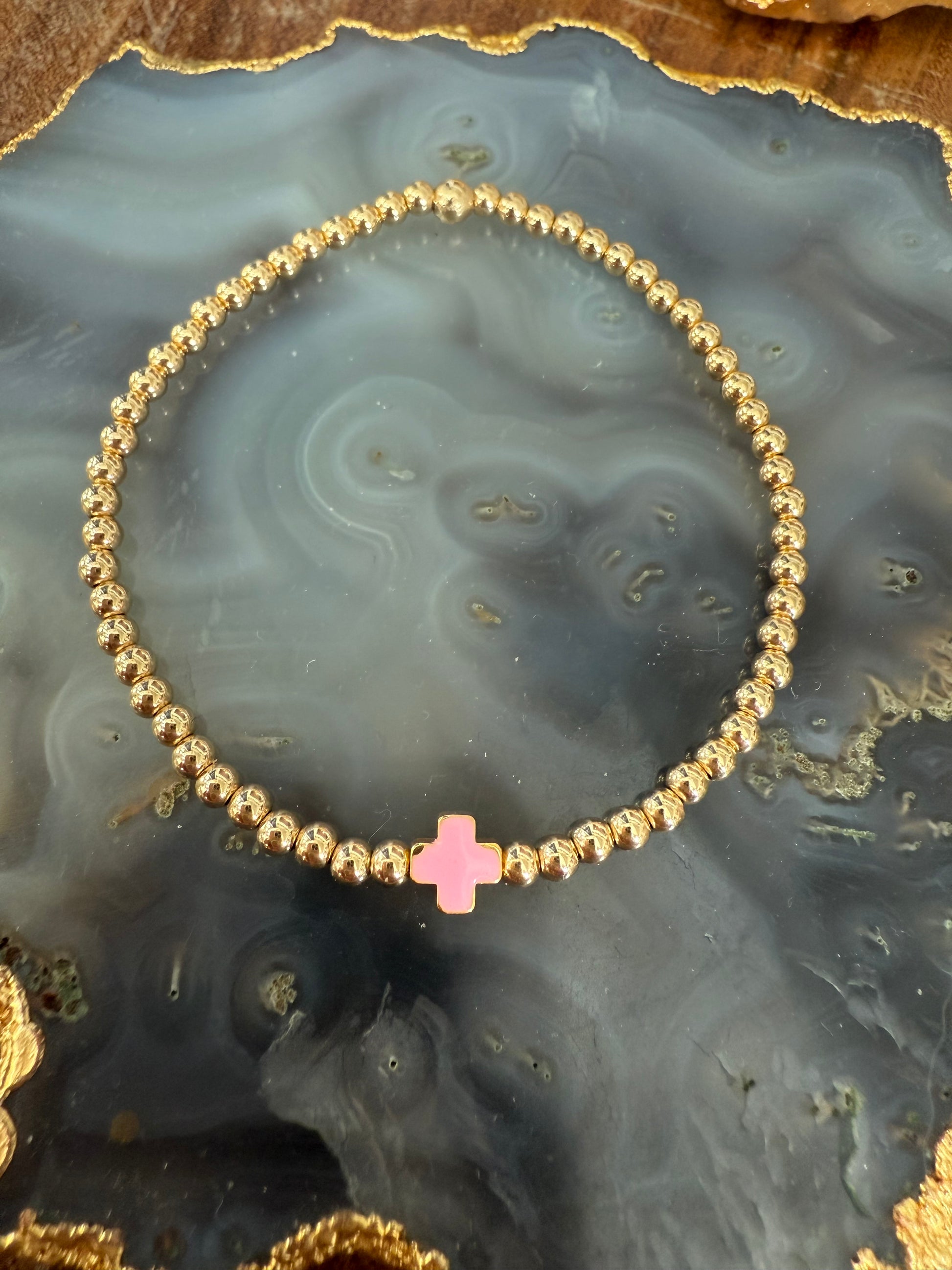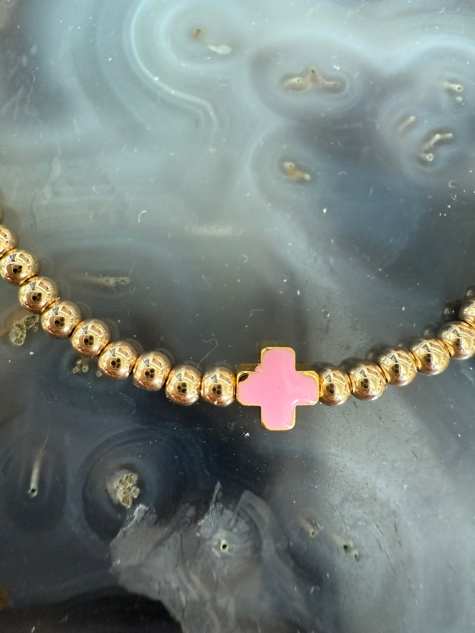 14K gold filled 3mm ball bracelet with Pink enamel cross charm.