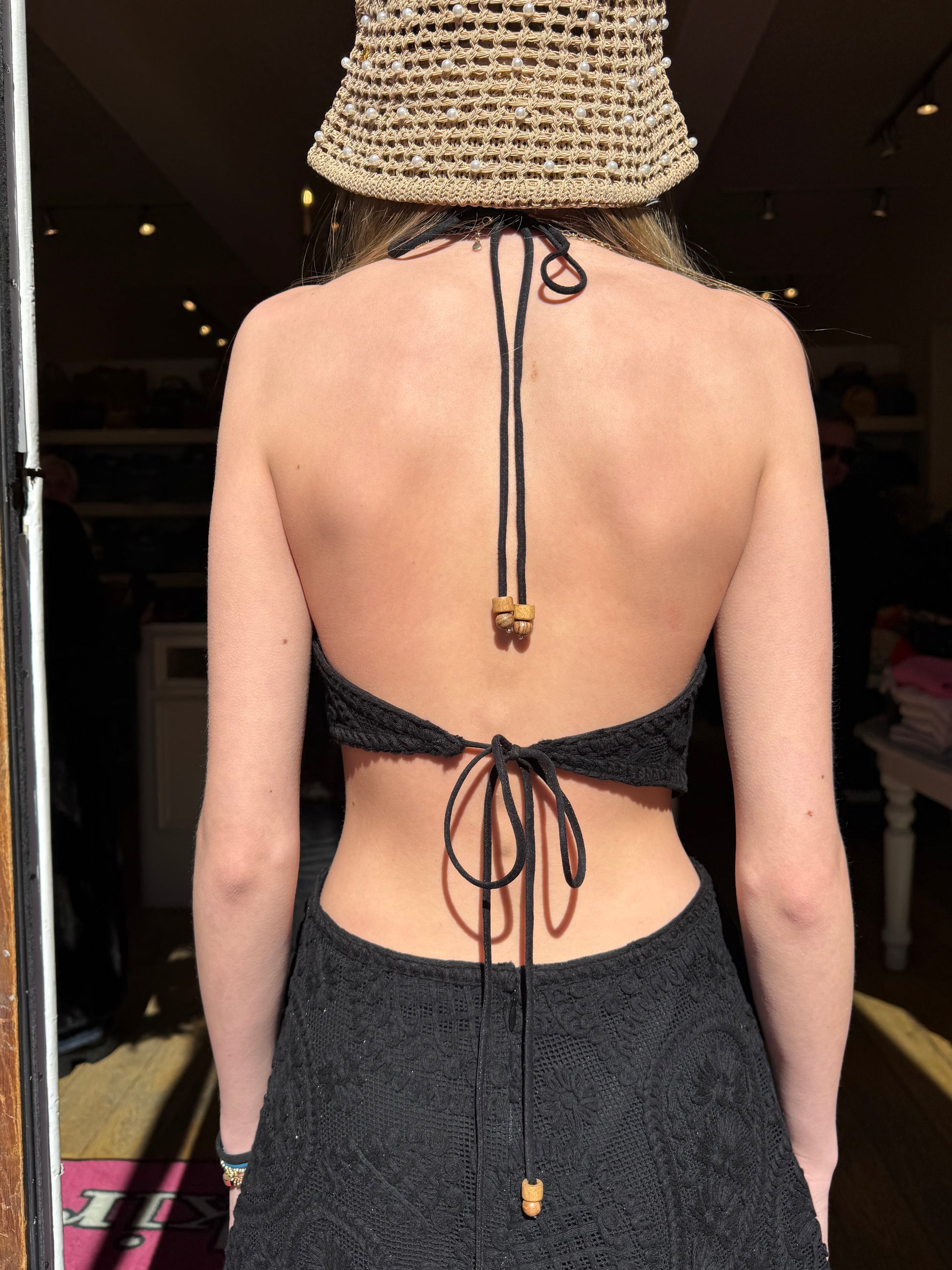 Black crochet mini dress with side cut outs and halter tie top and back tie.