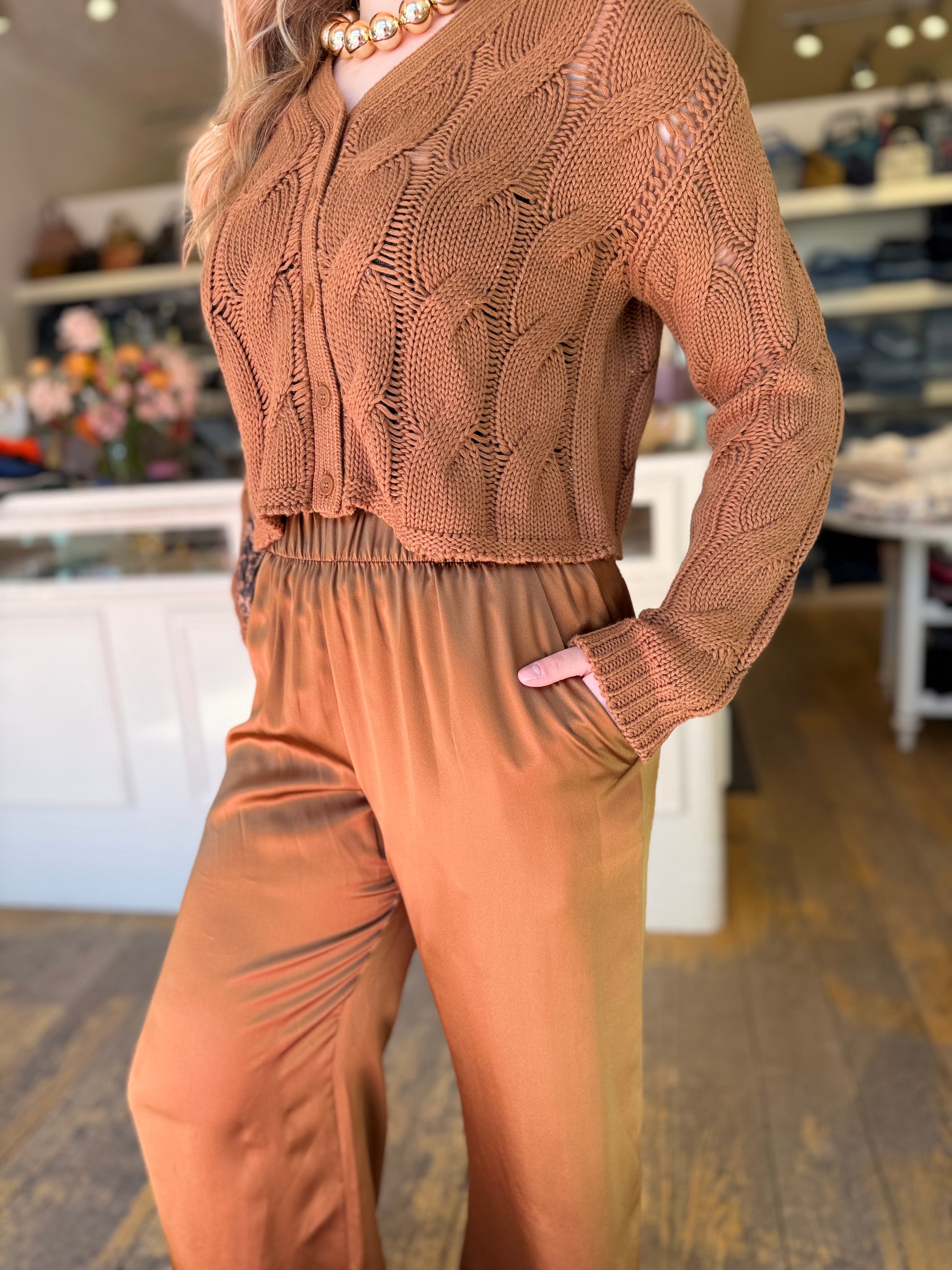 Pull-on wide-leg silk pant with a flat front and elastic waistband.