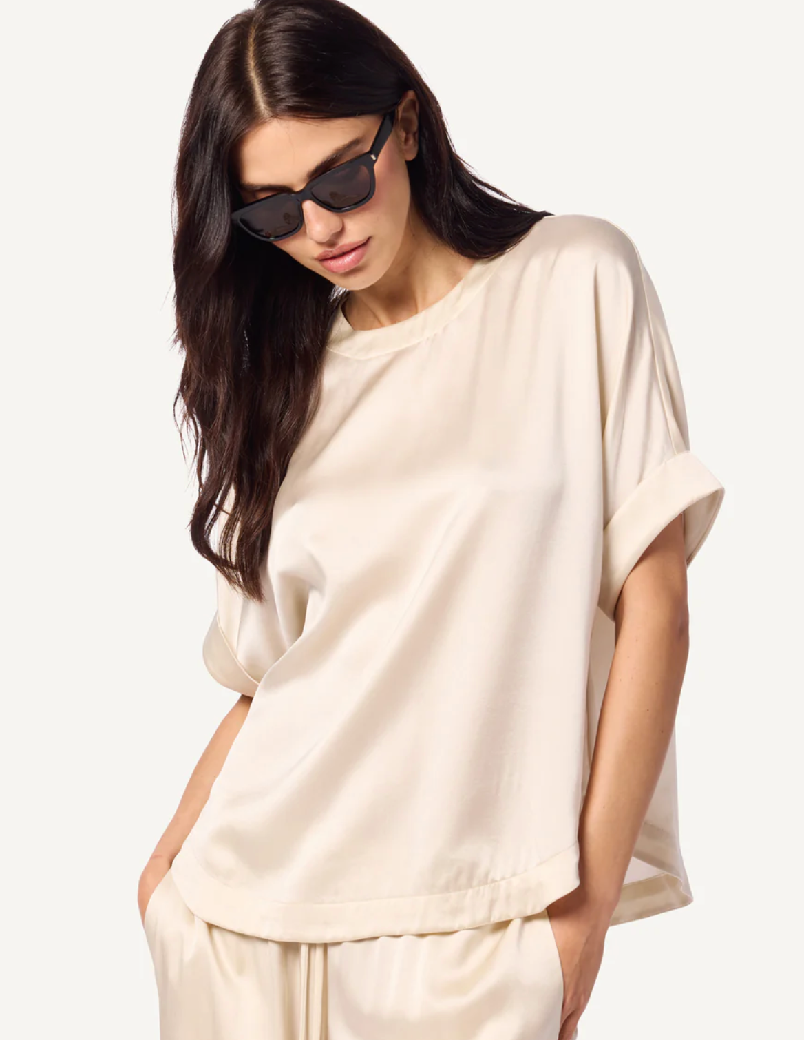 The Nessa Silk Top features a classic crew neck and short sleeves with hem cuffs, complemented by a distinctive scallop bottom. Crafted from luxurious silk, this top combines elegance with casual style, making it a versatile addition to any wardrobe.