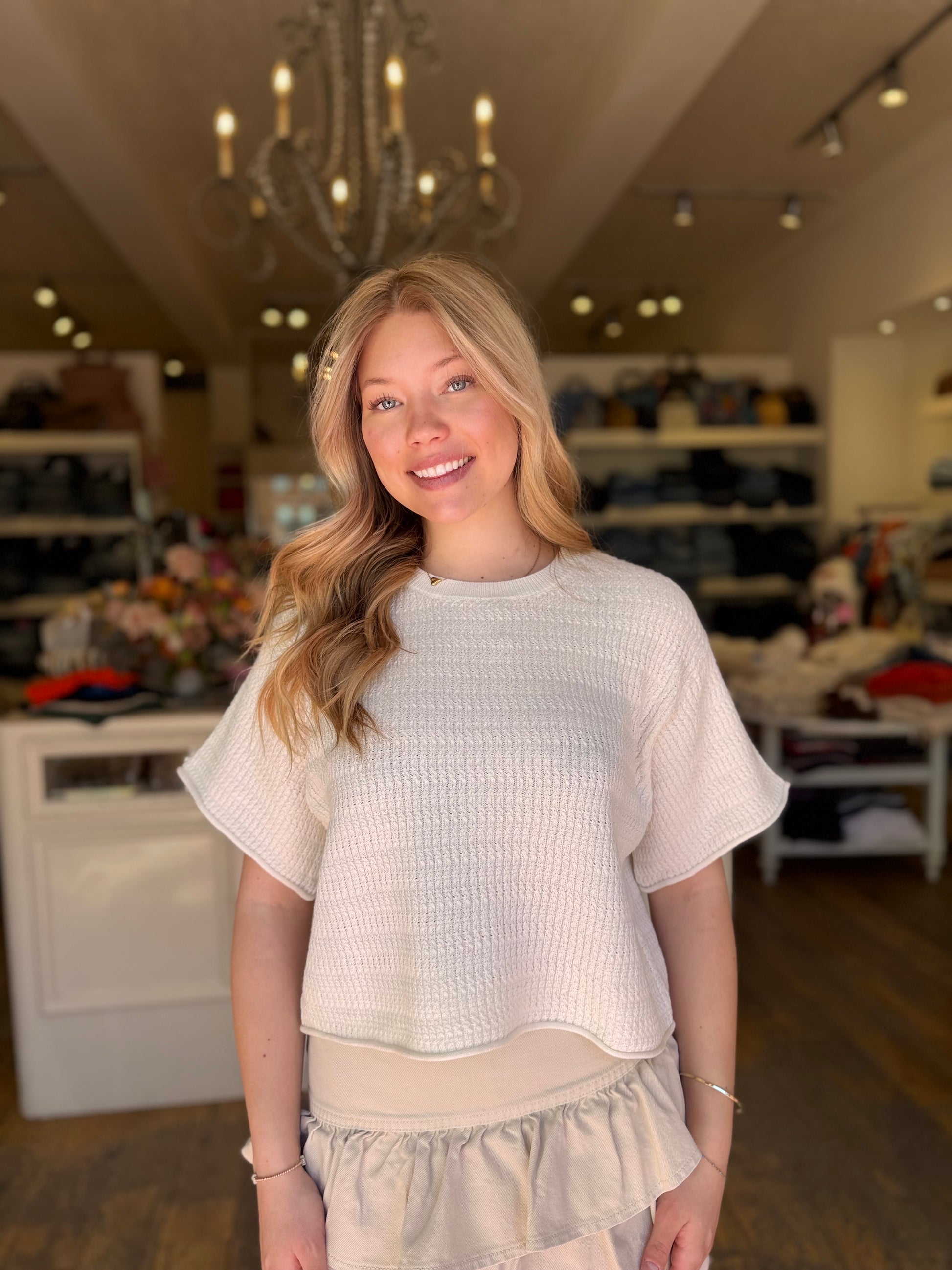 Relaxed boxy short sleeve cotton cashmere crew neck top with mini cable knit pattern.