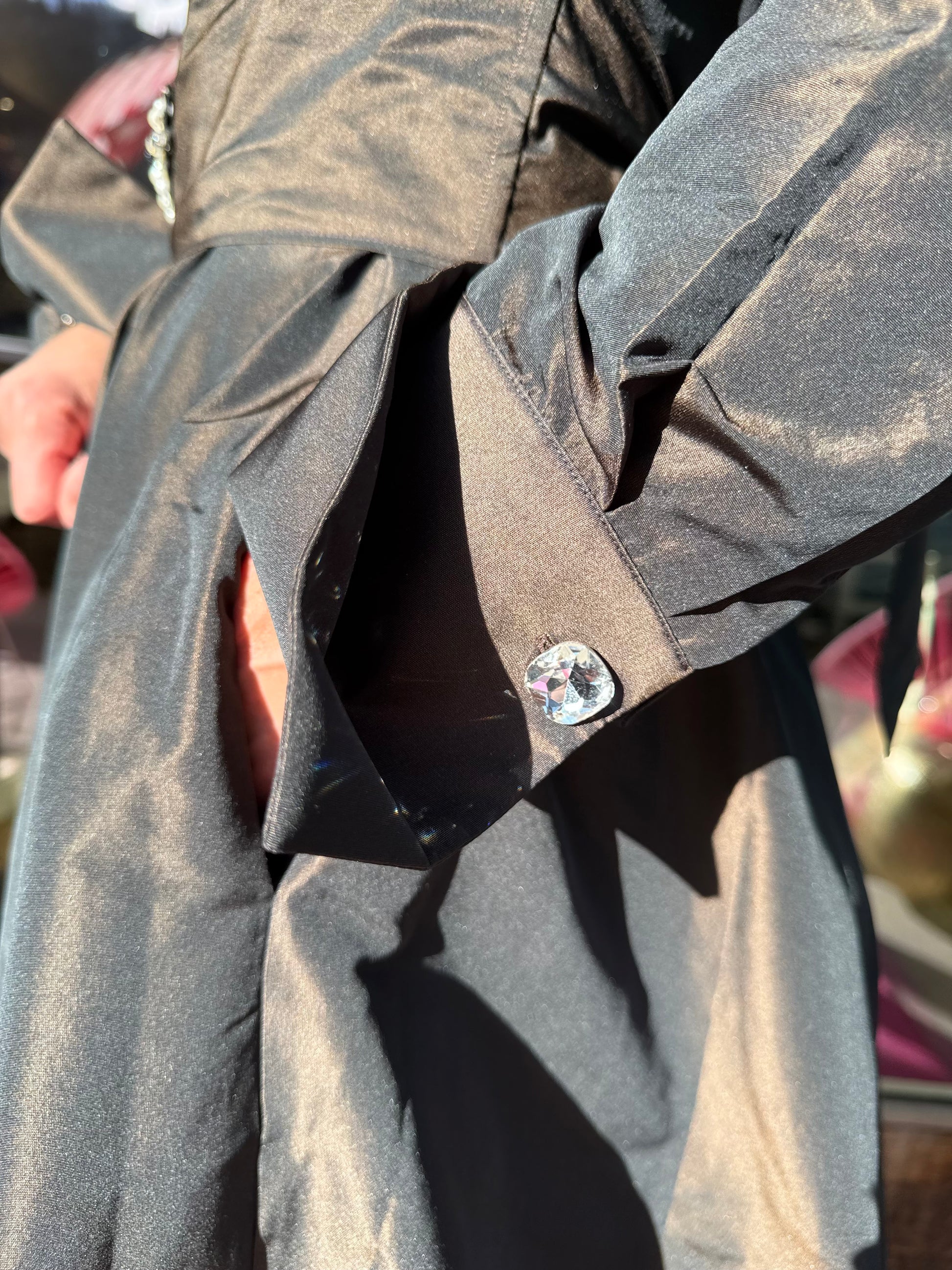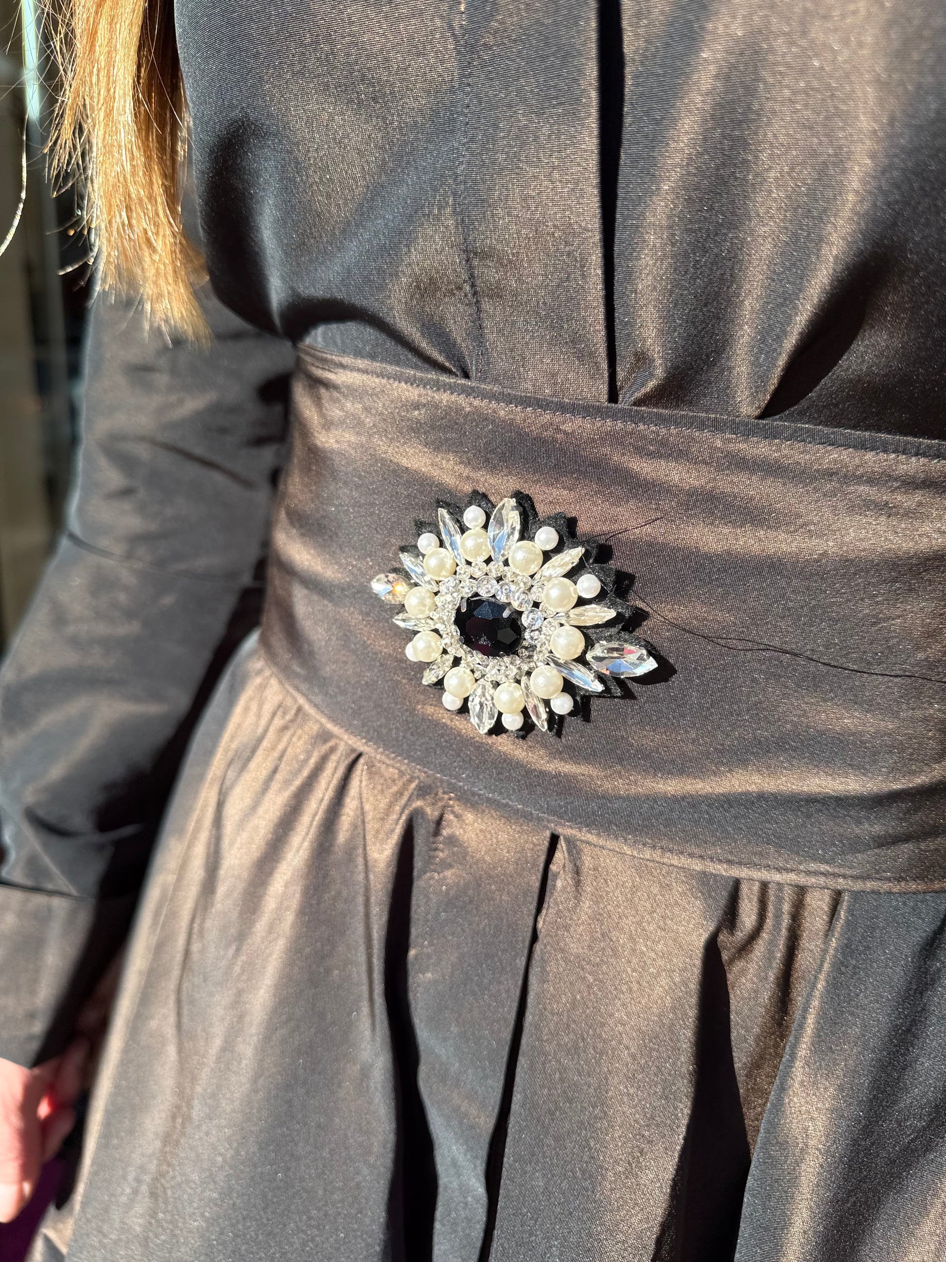 Iridescent black and brown long gown from Sara Roka. Belt sold with the dress. Rhinestone button cuffs. Pockets. Made in Italy.