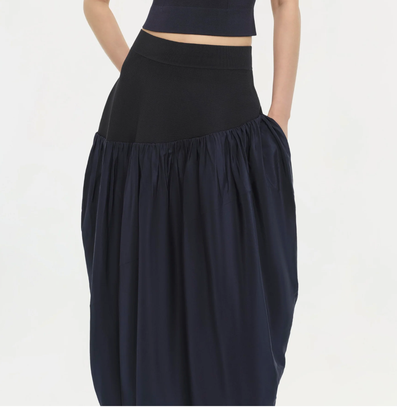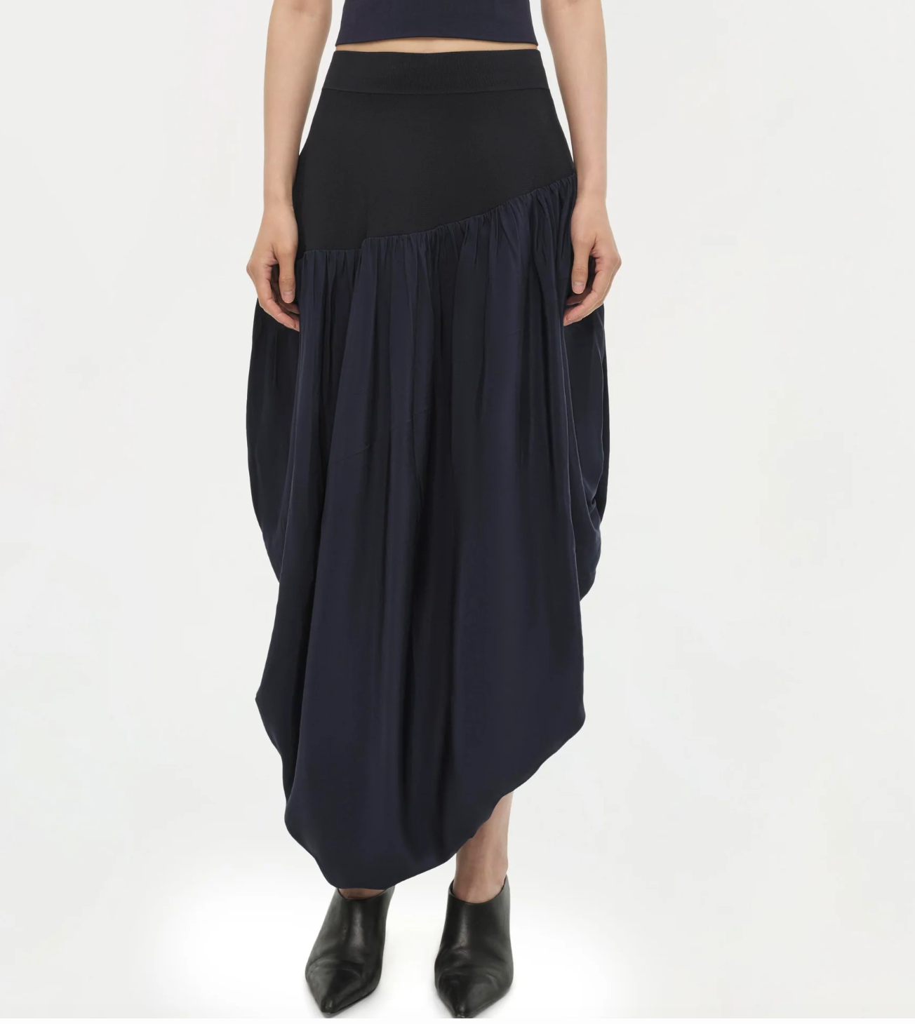 Simkhai Nala Skirt in Midnight. This combo midi features a unique design that combines structured and flowing elements for a standout look. Its asymmetrical hem and fitted waistband create a striking silhouette that effortlessly enhances your style. Pull on style