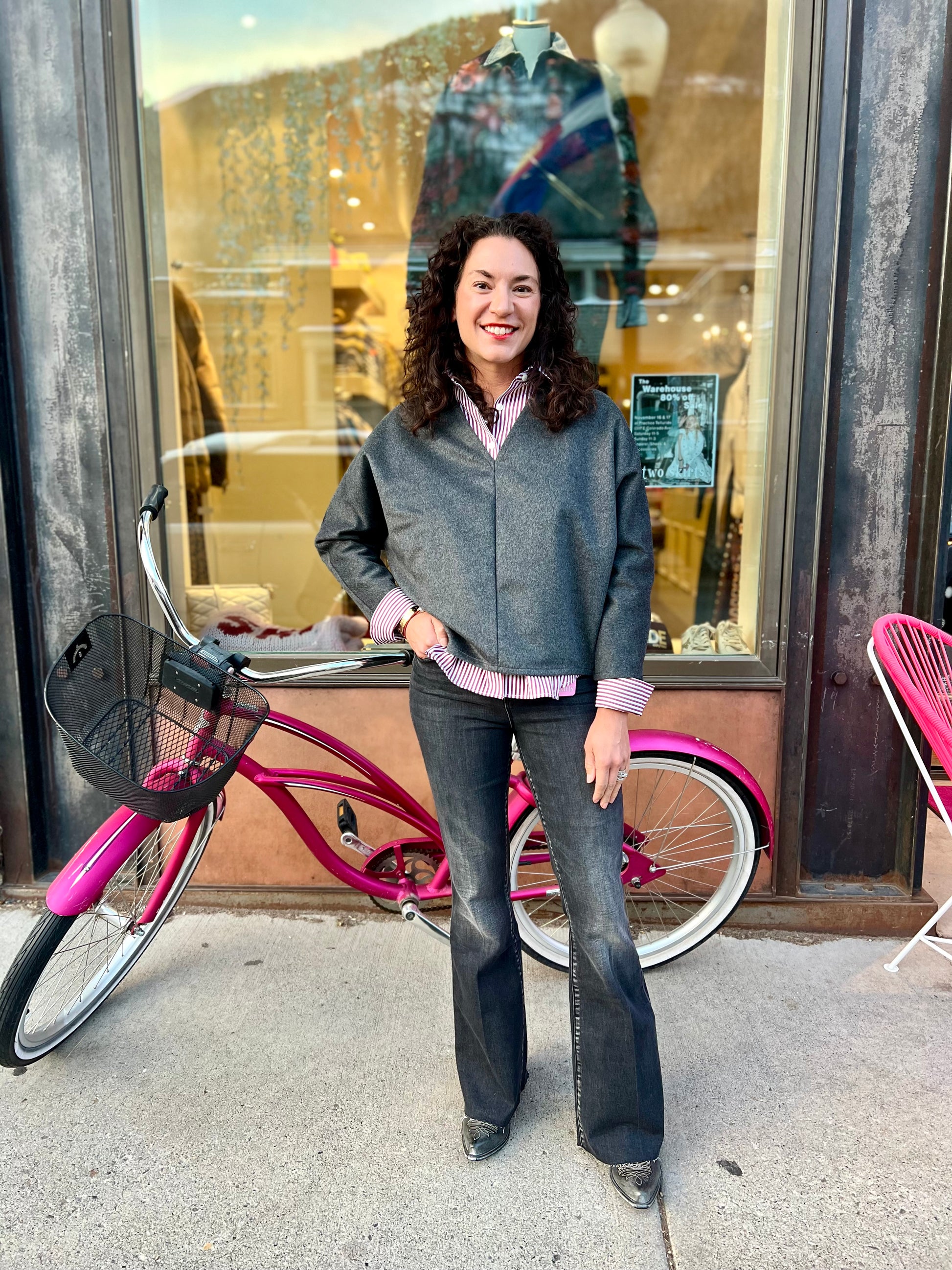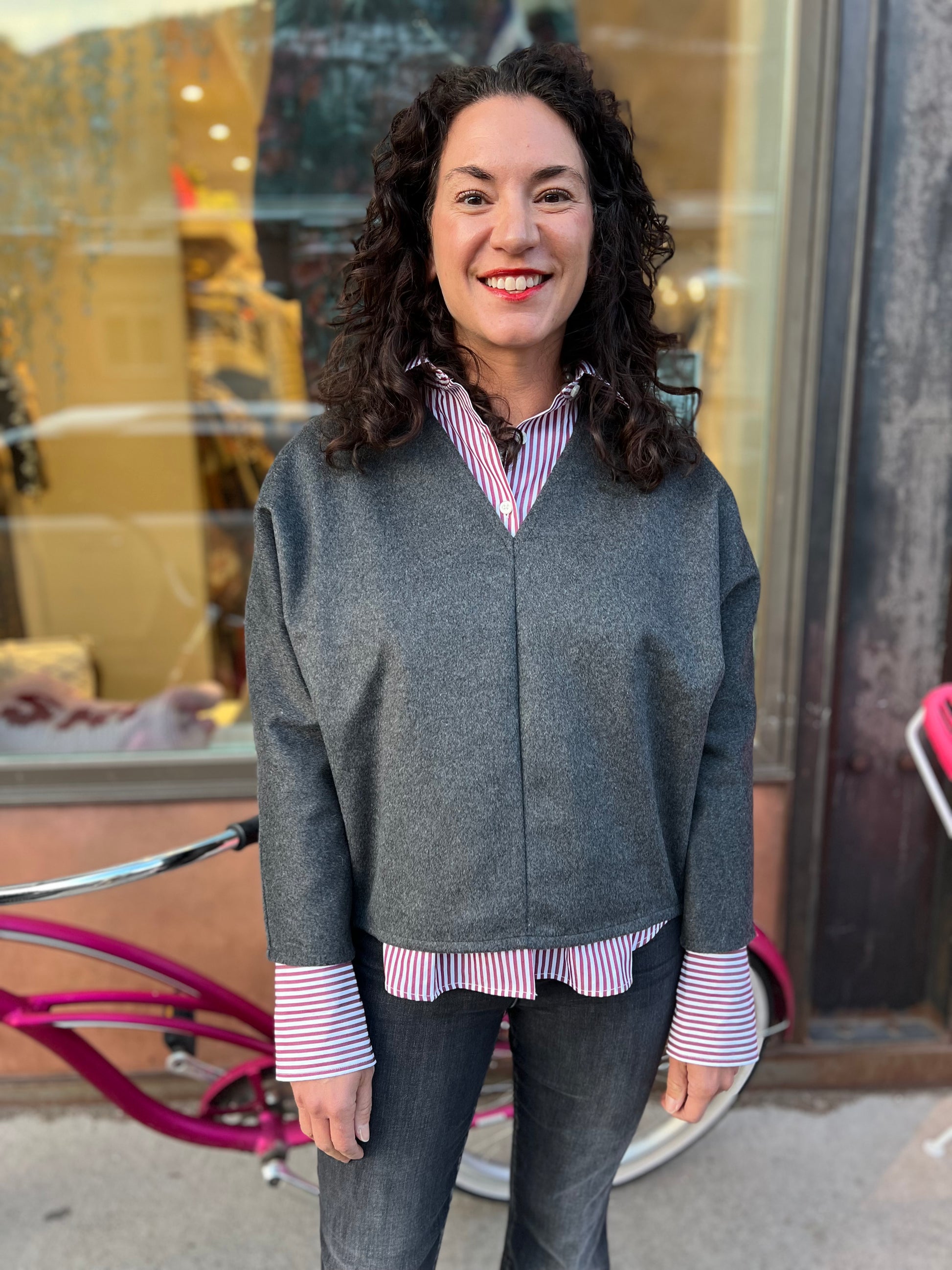 Flannel V neck boxy wedge shape sweater. Layer over a T. Line button down crisp striped shirt.