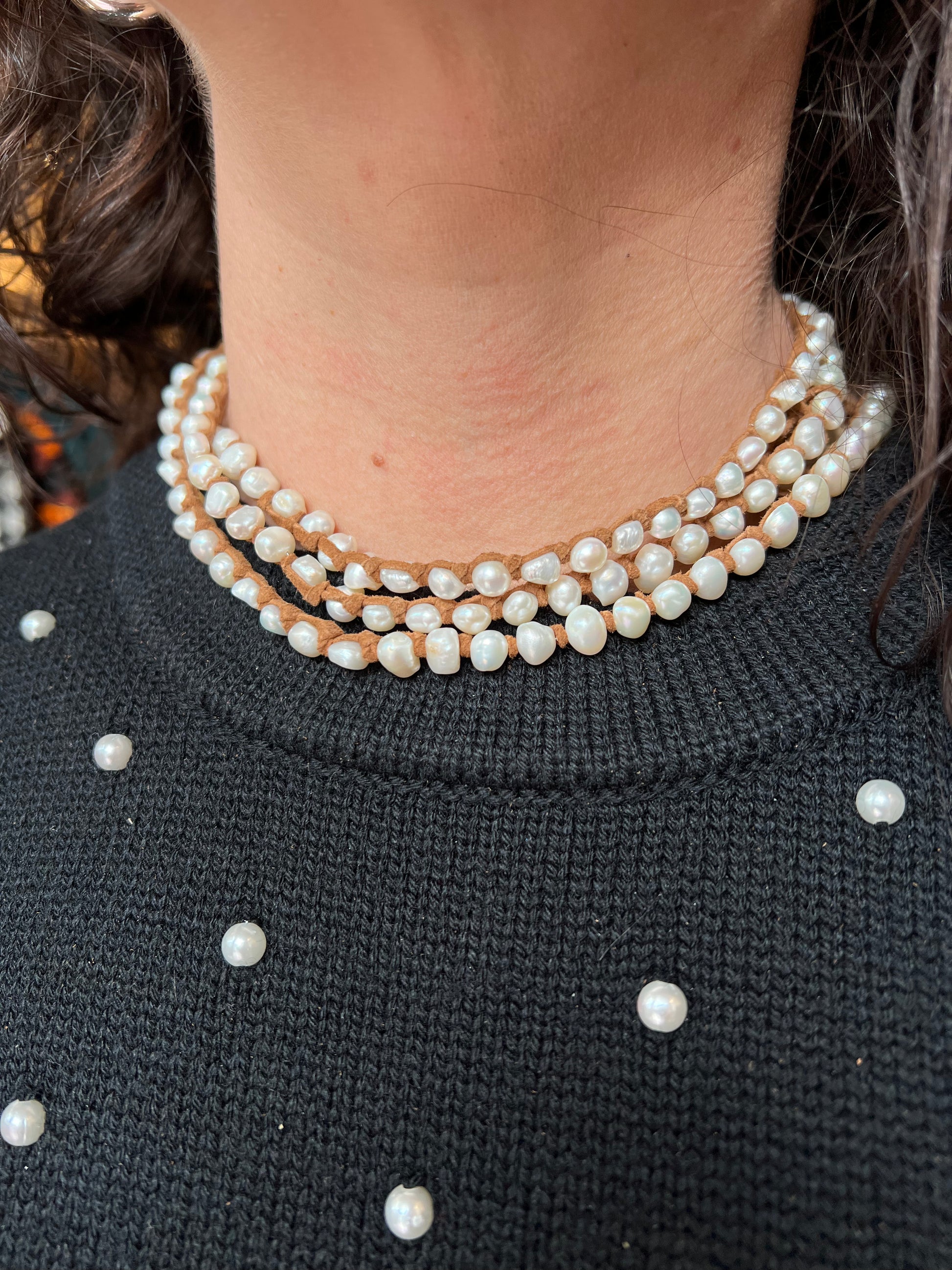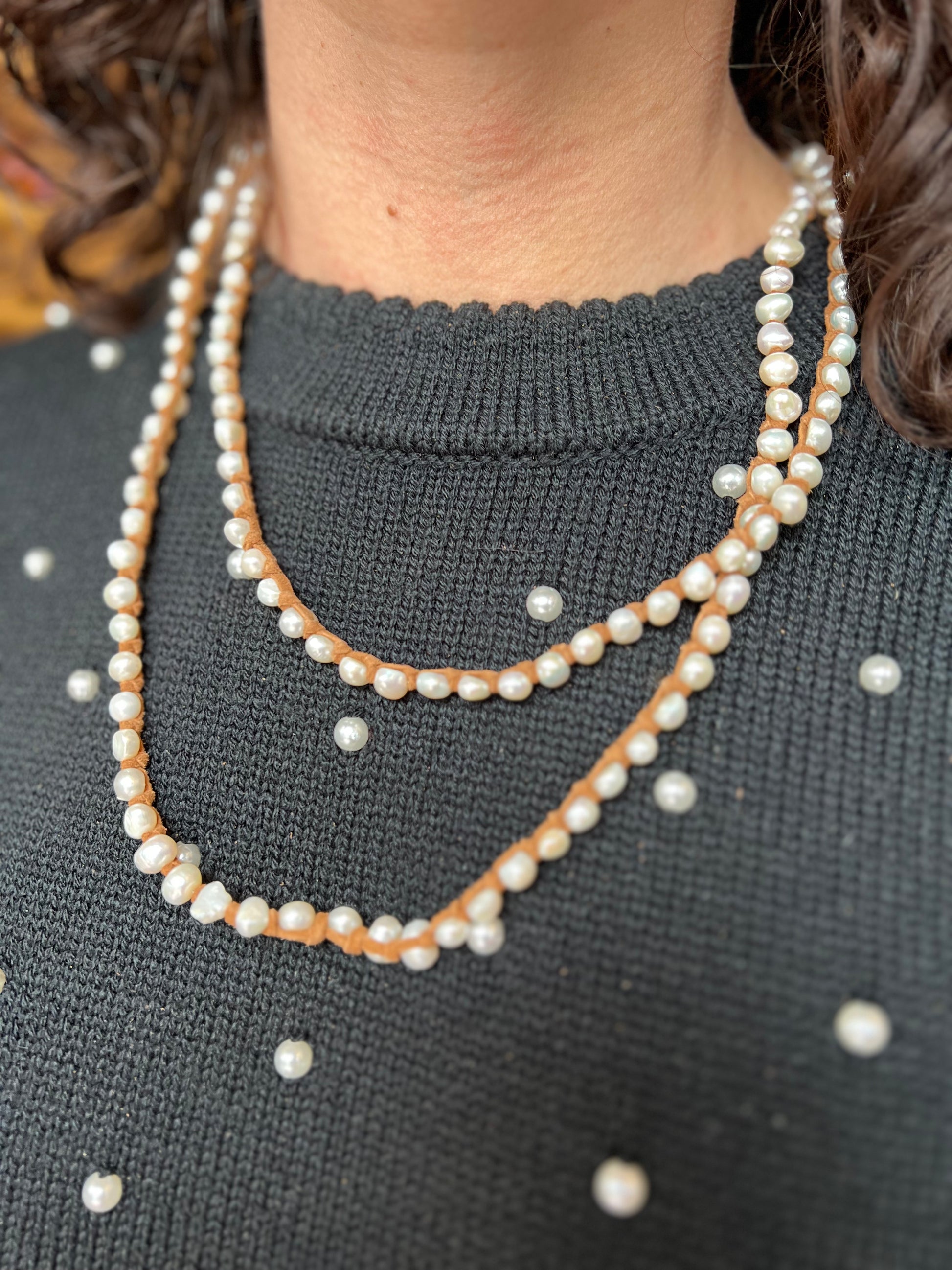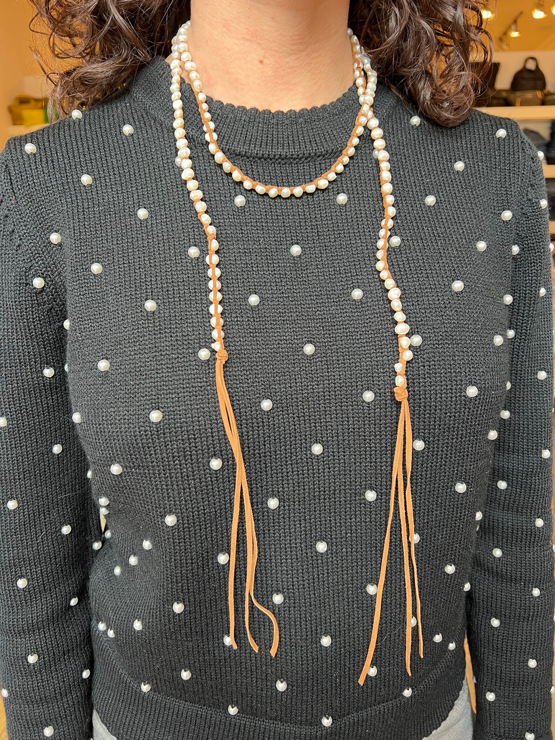 Freshwater pearls laced and hand tied with flat suede. Can be worn layered, wrapped or paired. This strain is 45” from bead to bead.