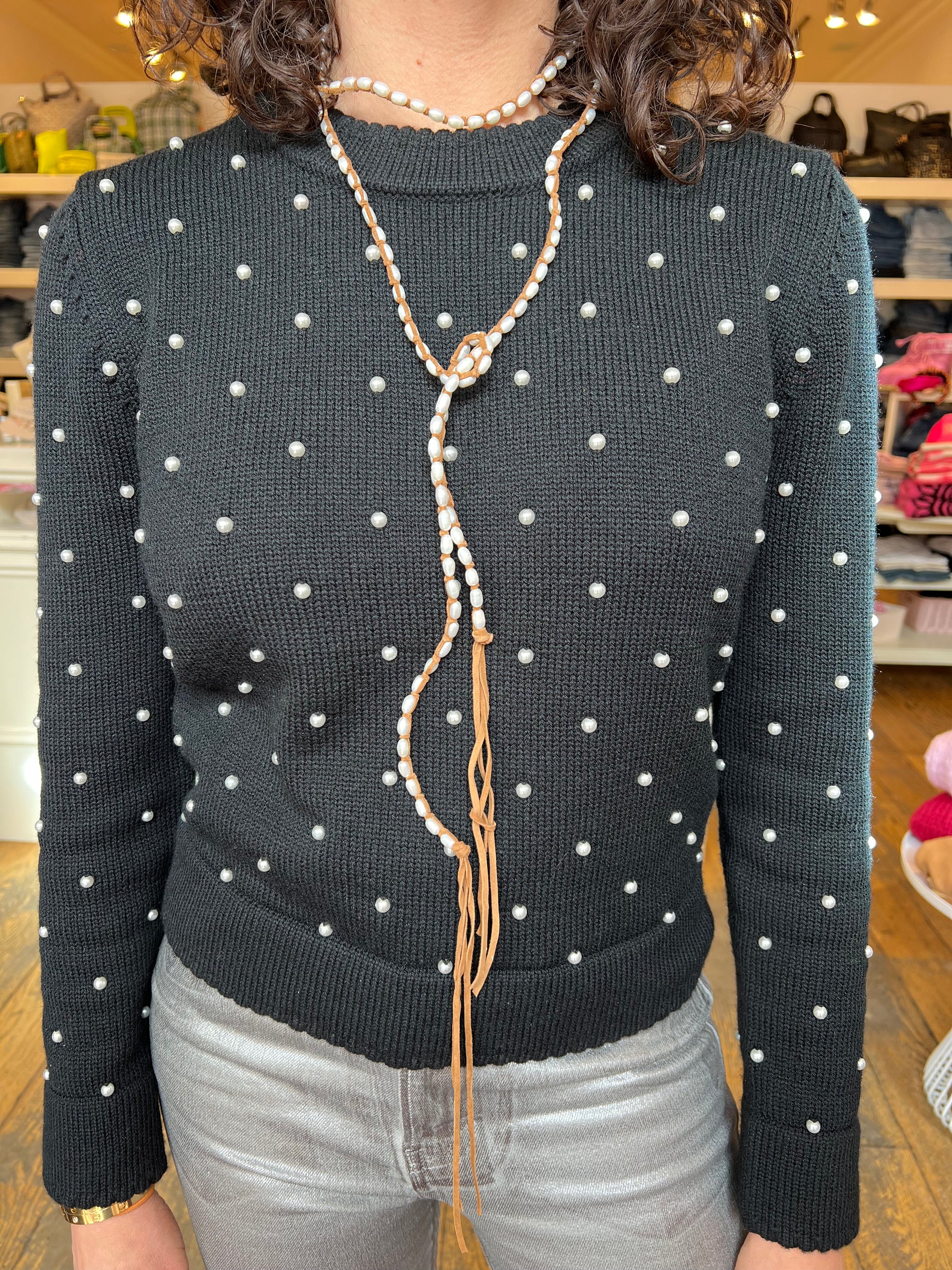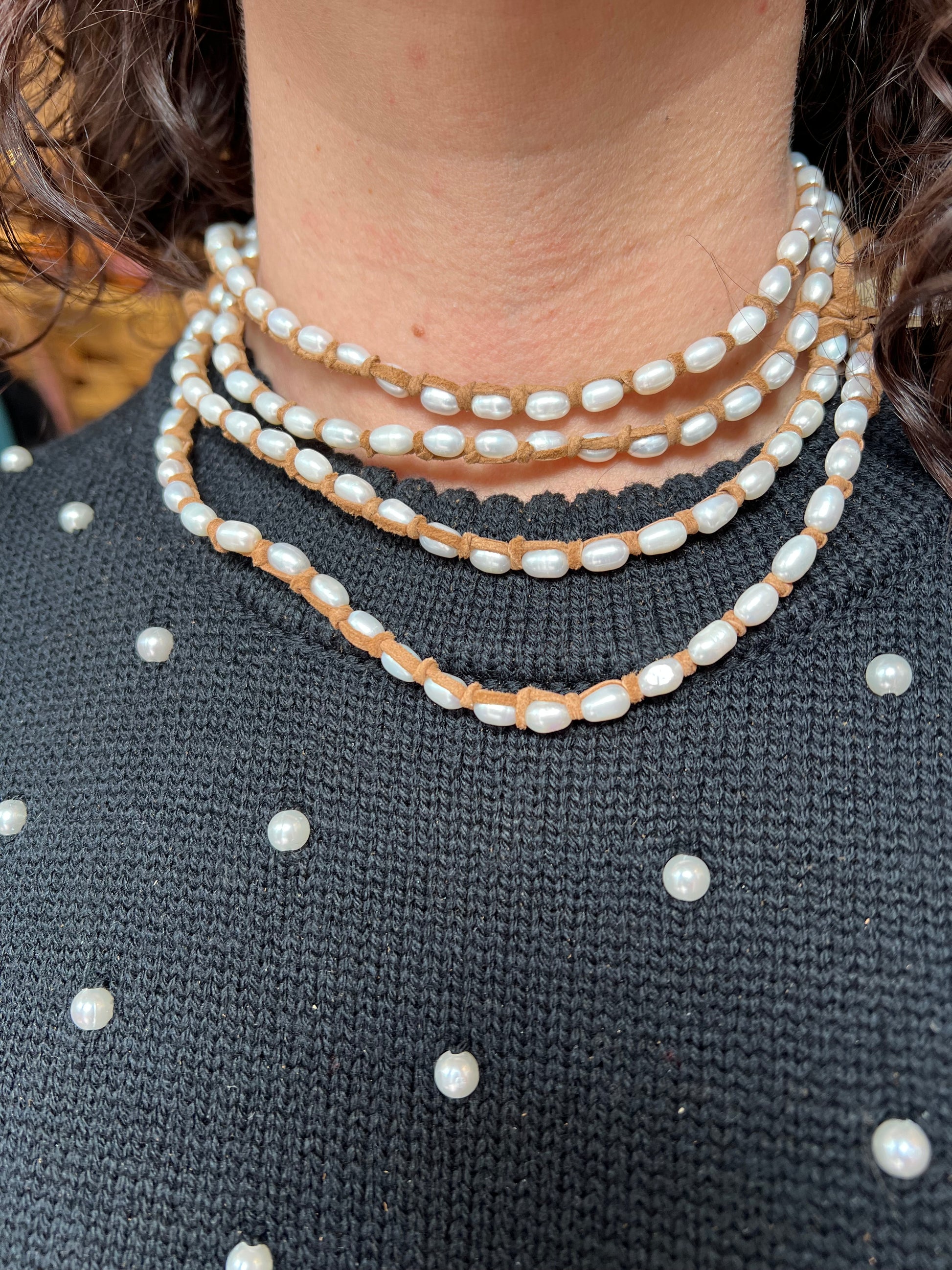 Freshwater pearls laced and hand tied with flat suede. Can be worn layered, wrapped or paired. This strain is 57-60” from bead to bead.