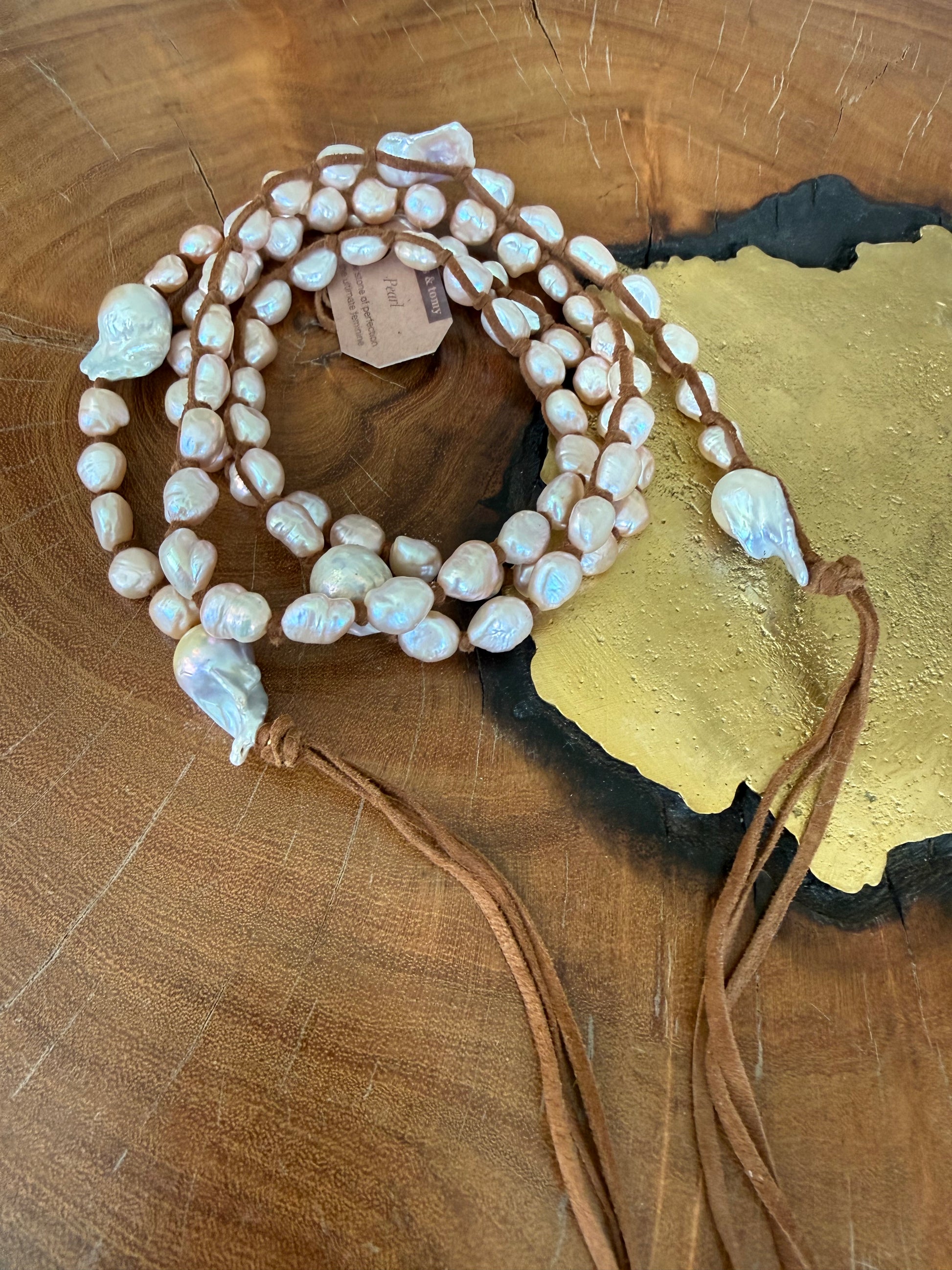 Pink medium pearls with large baroque mixed in on brown suede. 46” pearls plus suede ties.