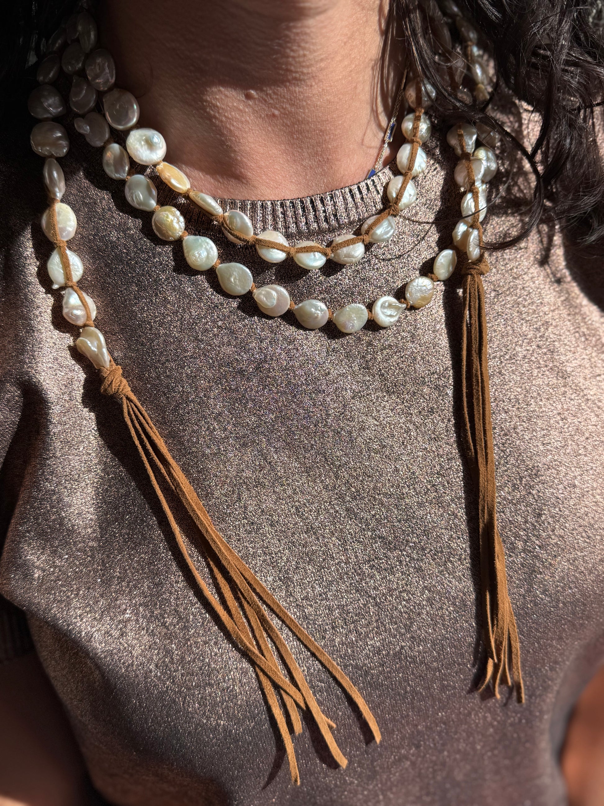 57-60" extra long pearls on suede. Can wrap 4 times as choker. Hand strung.