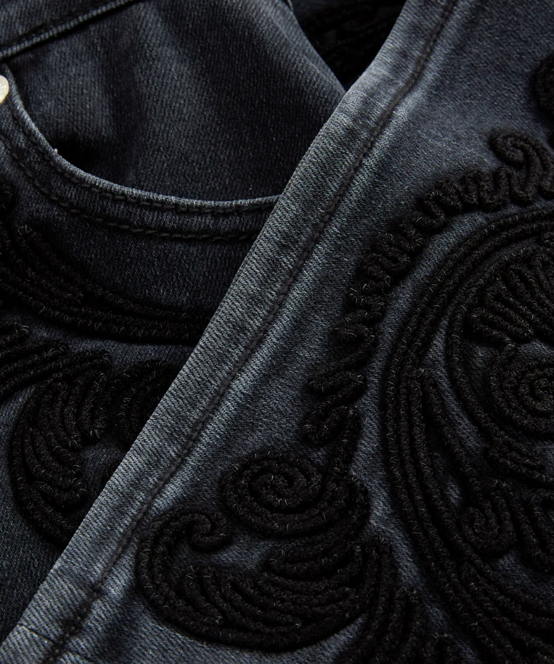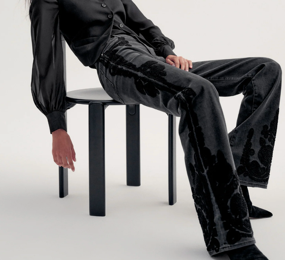 The Crosbie you know and love—now with a boho twist. Crafted from black super-stretch Turkish denim, it features paisley embroidery along the side of the leg. Fitted through the hips and thighs, this high-rise, slimmed-out wide-leg jean is expertly tailored for an elongating effect and finished with our signature V belt loops. For an elevated take on casual-chic, we love pairing it with a simple T-shirt and heels.