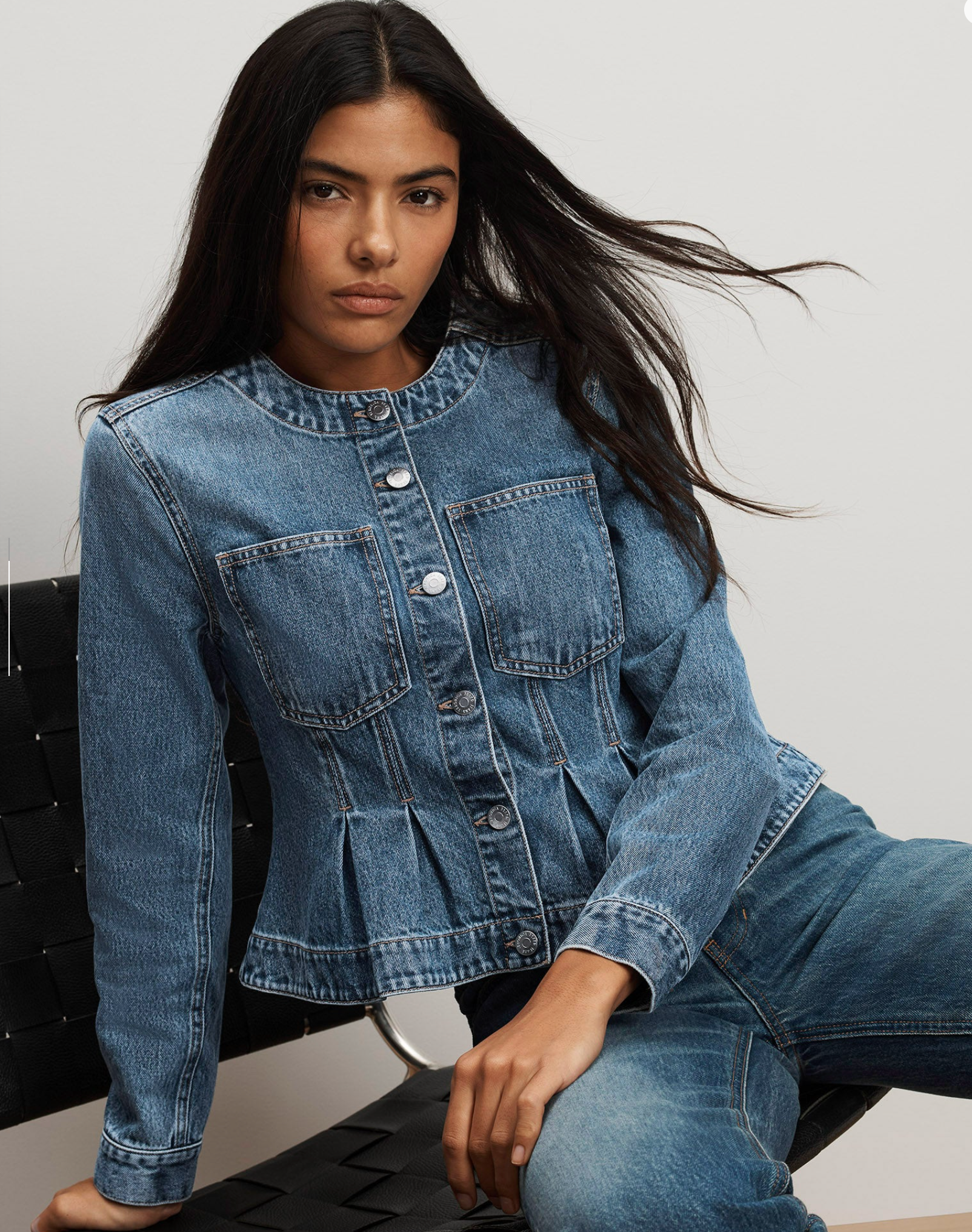A feminine take on the denim jacket. Crafted from rigid Japanese denim in a classic blue wash, the Zahara is tailored for a waist-defining fit, featuring a slim bodice that flares into a peplum hem below the natural waist. Finished with a clean, collarless neckline, a modern take on double denim.