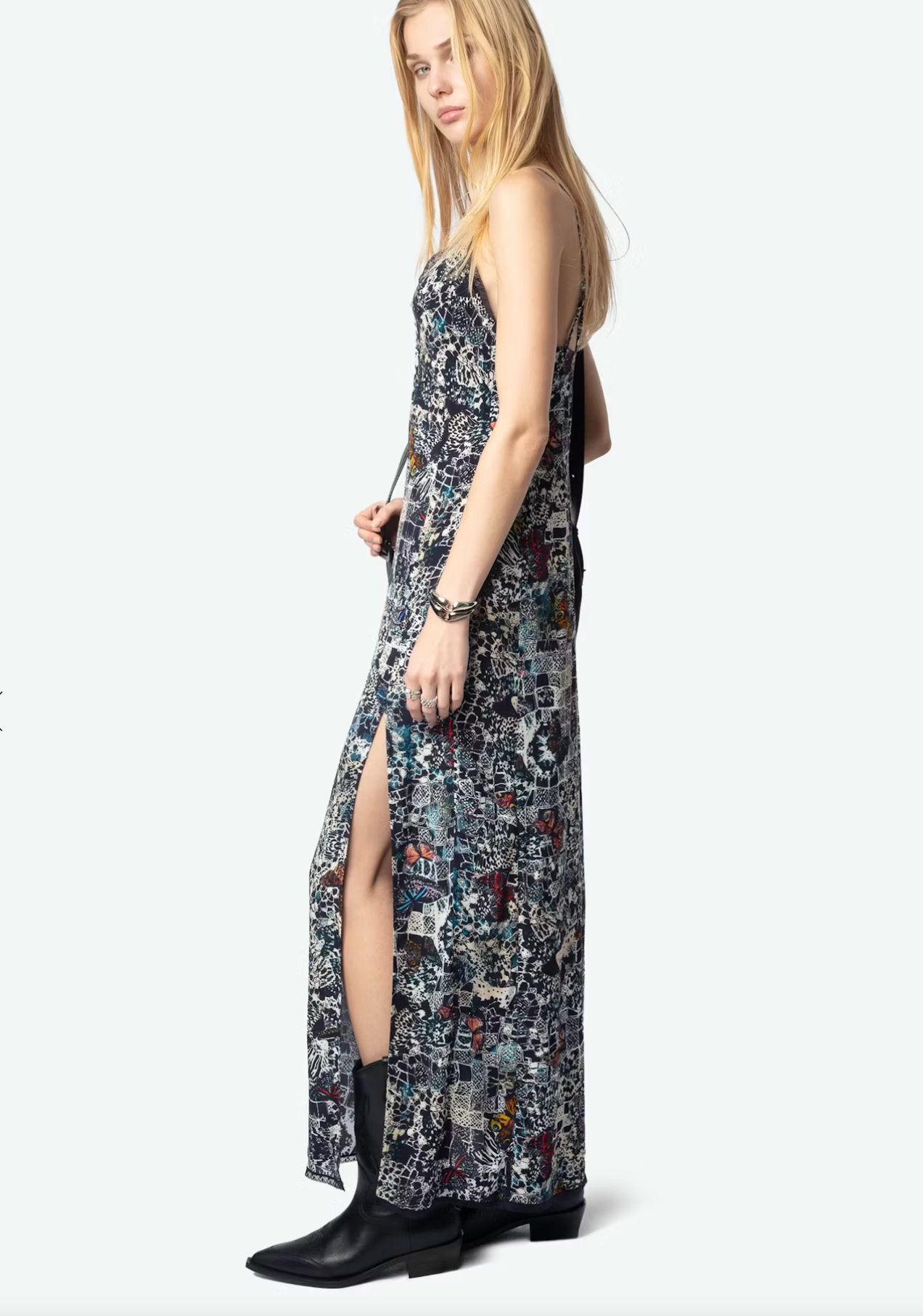 Long lingerie-inspired printed viscose dress with a slit, adjustable straps, embroidered wings on the back, and lace detailing.