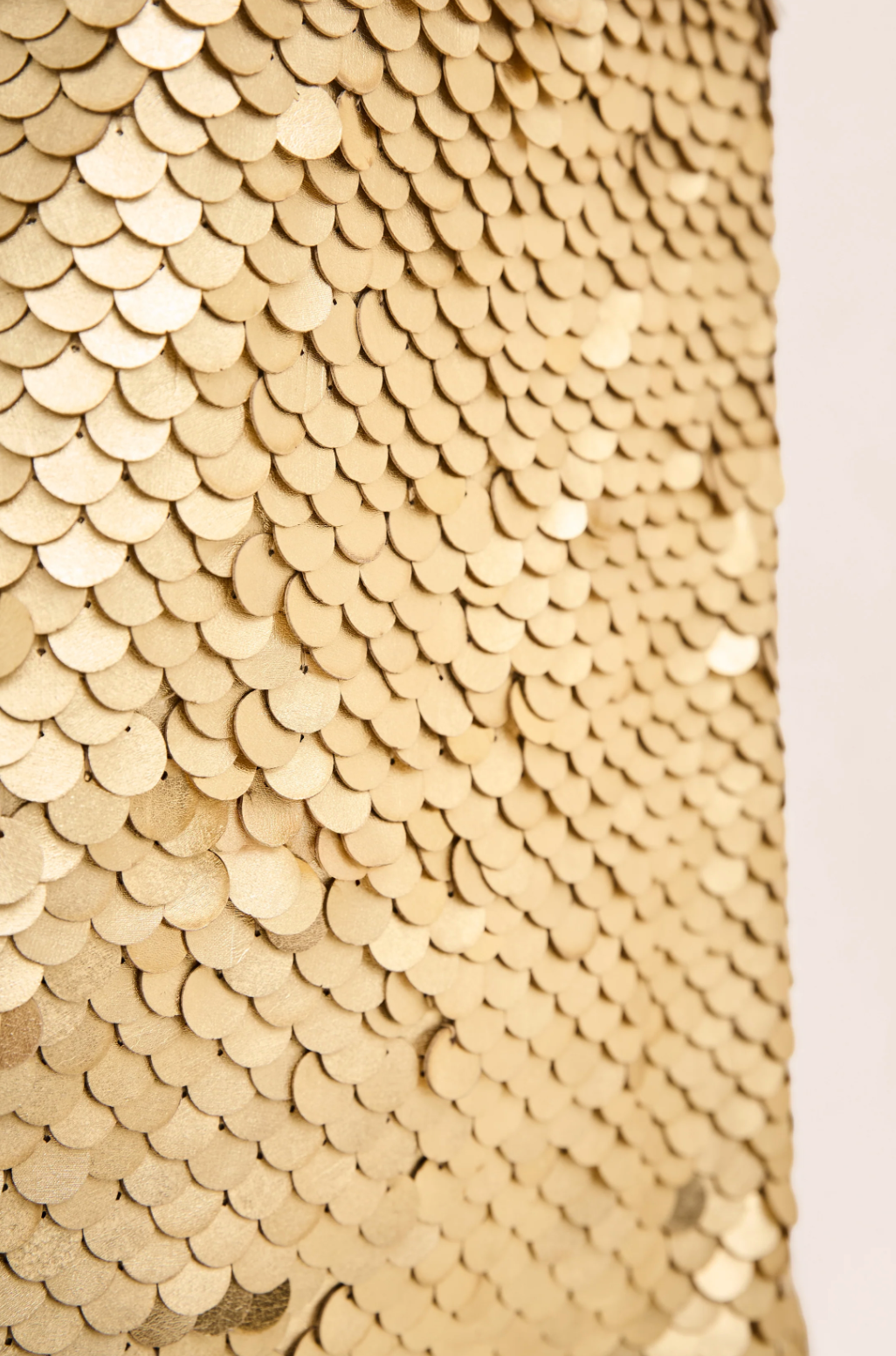 The Eli Dress is a mini dress featuring a scoop neckline, detailed with gold leather paillettes.