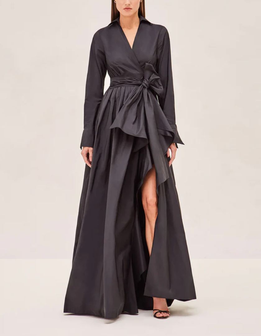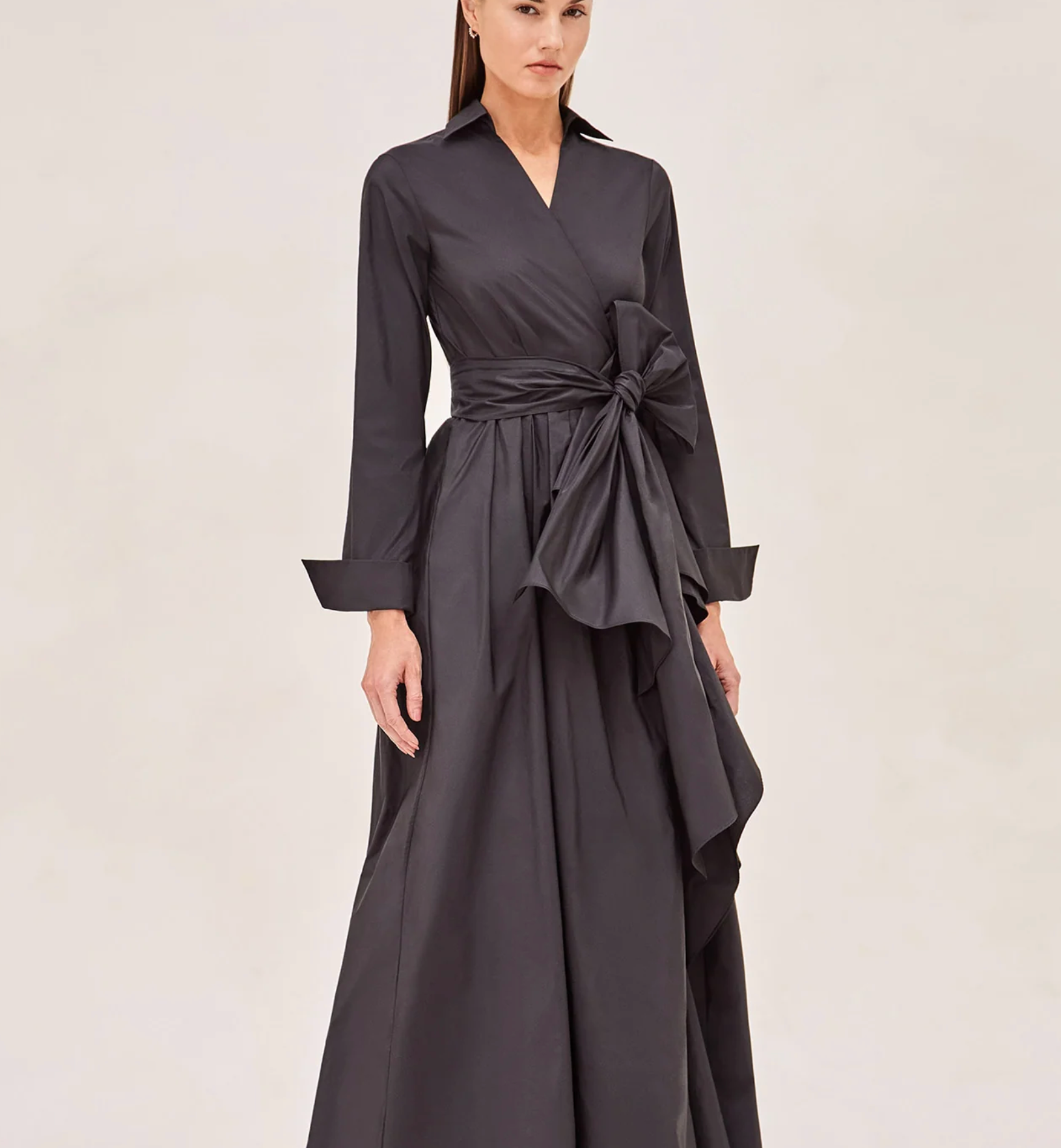 The Ollie Dress is a timeless gown with a classic silhouette, perfect for a wedding or special event. Featuring a collar, long-sleeves, and an elegant cross over detail with a sash at the waist, this conservative dress exudes sophistication and elegance.