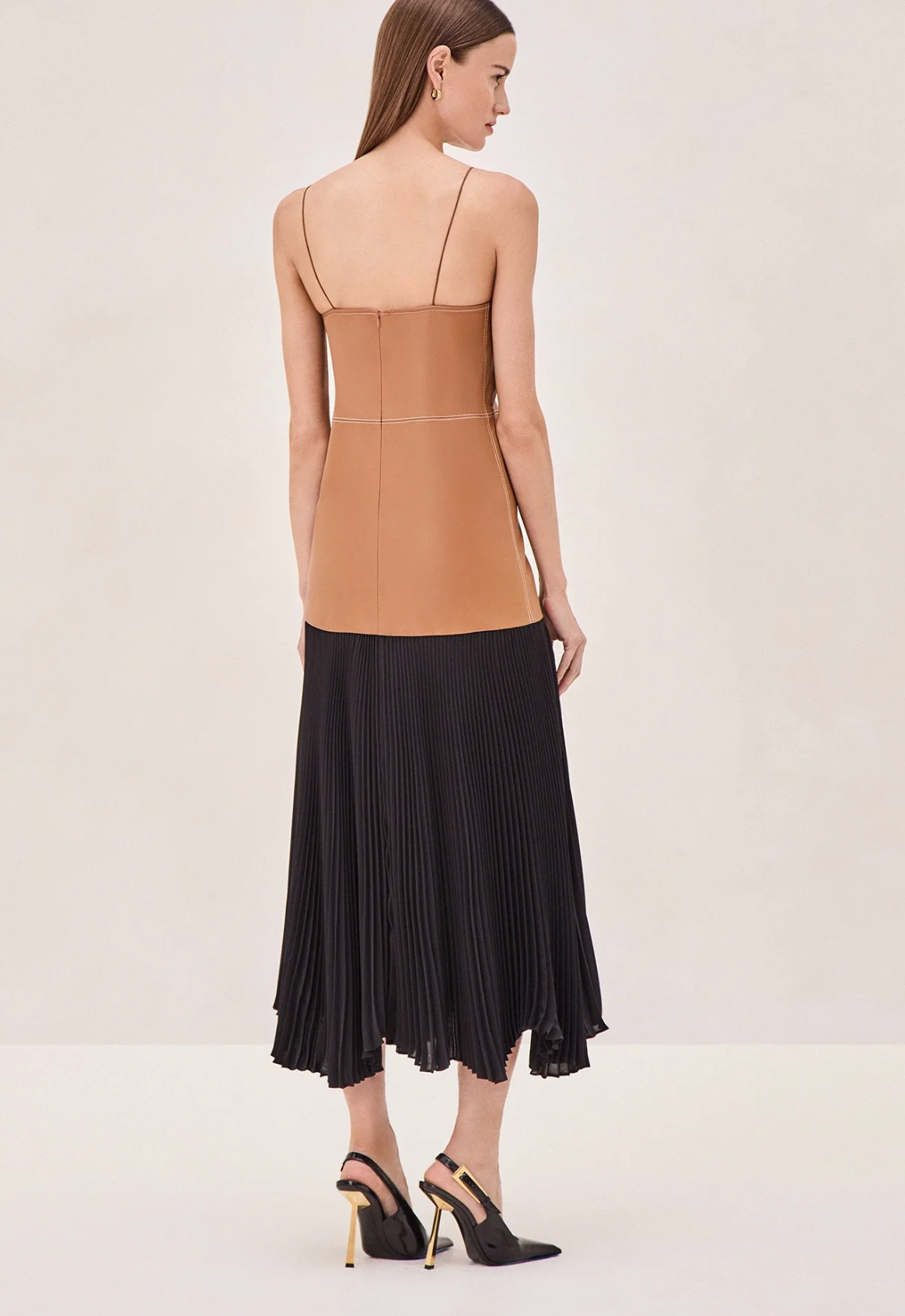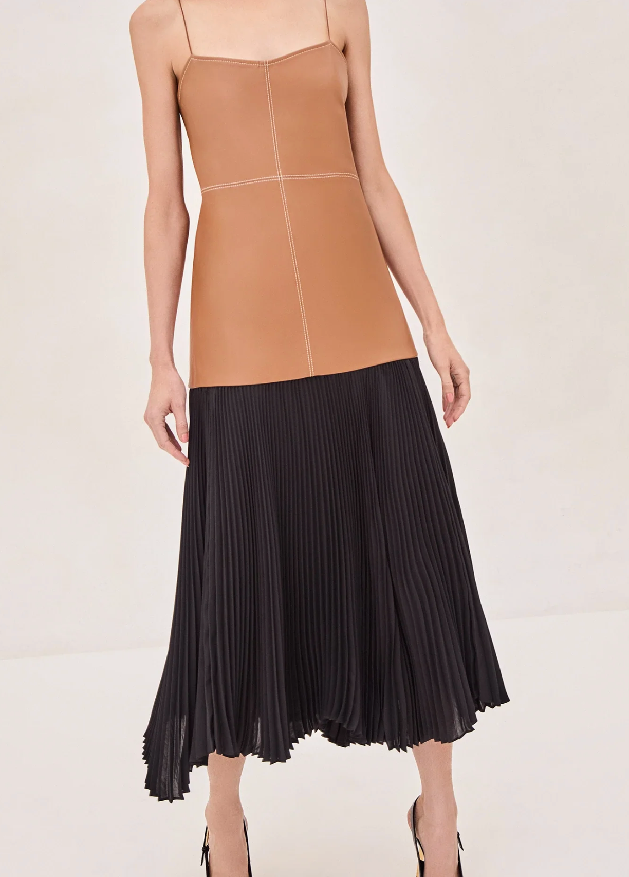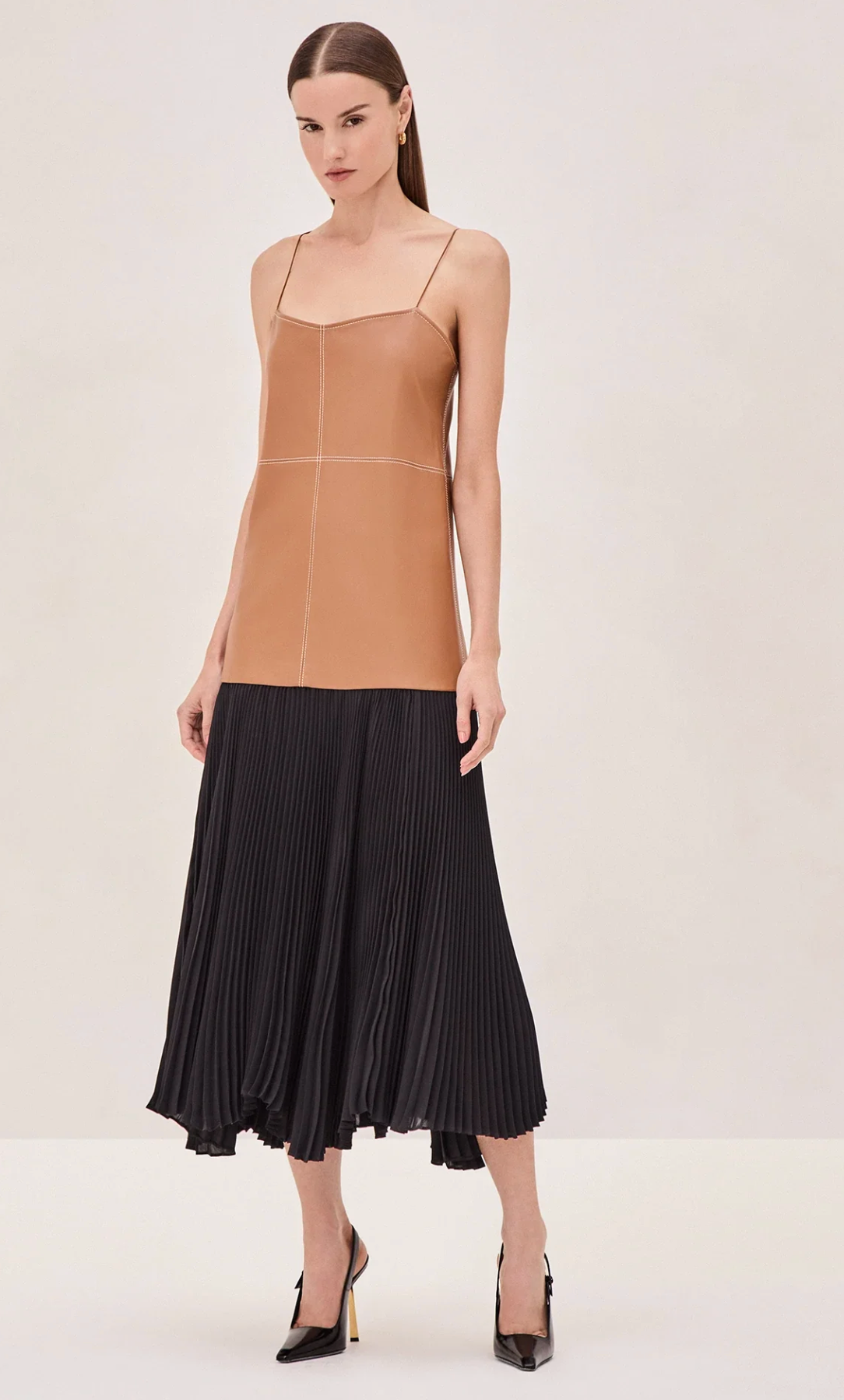 ntroducing the Piatta Midi, where sleek meets sophisticated. This dress combines the rich texture of vegan leather with the fluidity of a pleated skirt, creating a striking contrast that's effortlessly chic. The minimalist top has delicate spaghetti straps, giving it a modern, streamlined silhouette, while the flowing midi skirt adds movement and grace.