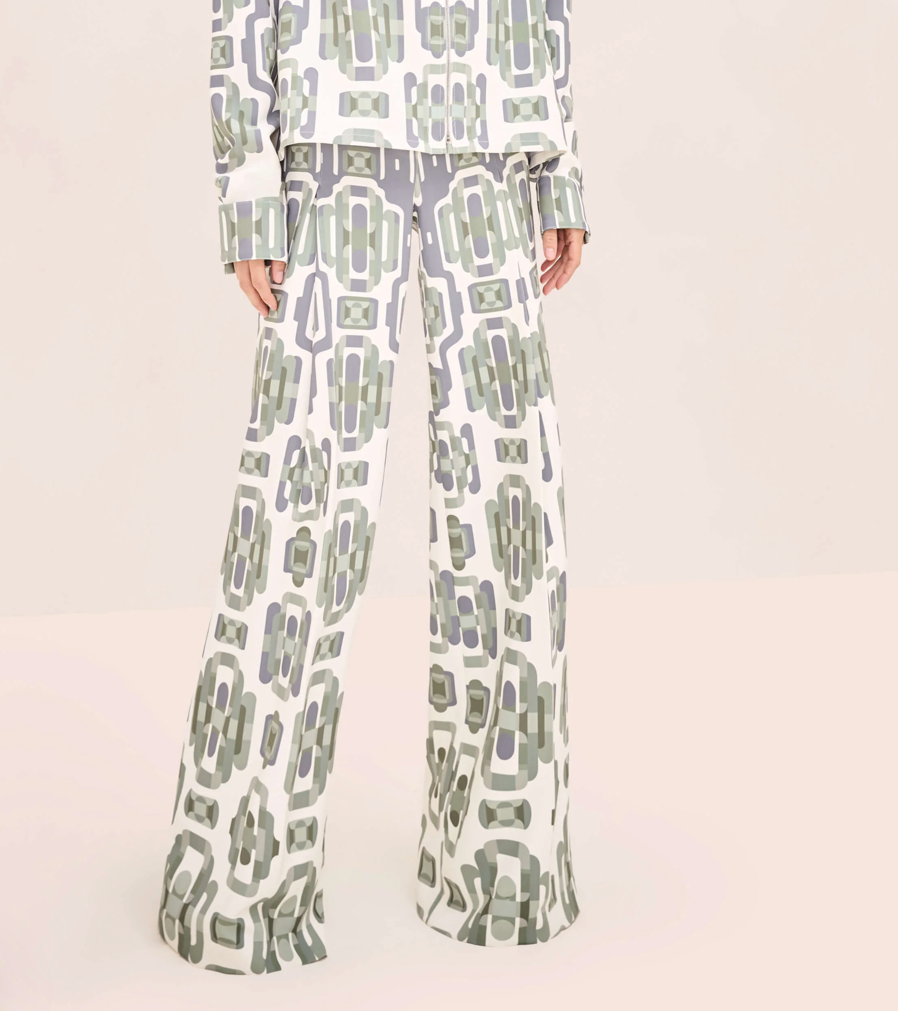 Salerno Pant is a wide leg trouser featuring a geometric print.