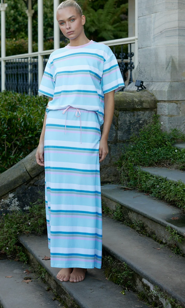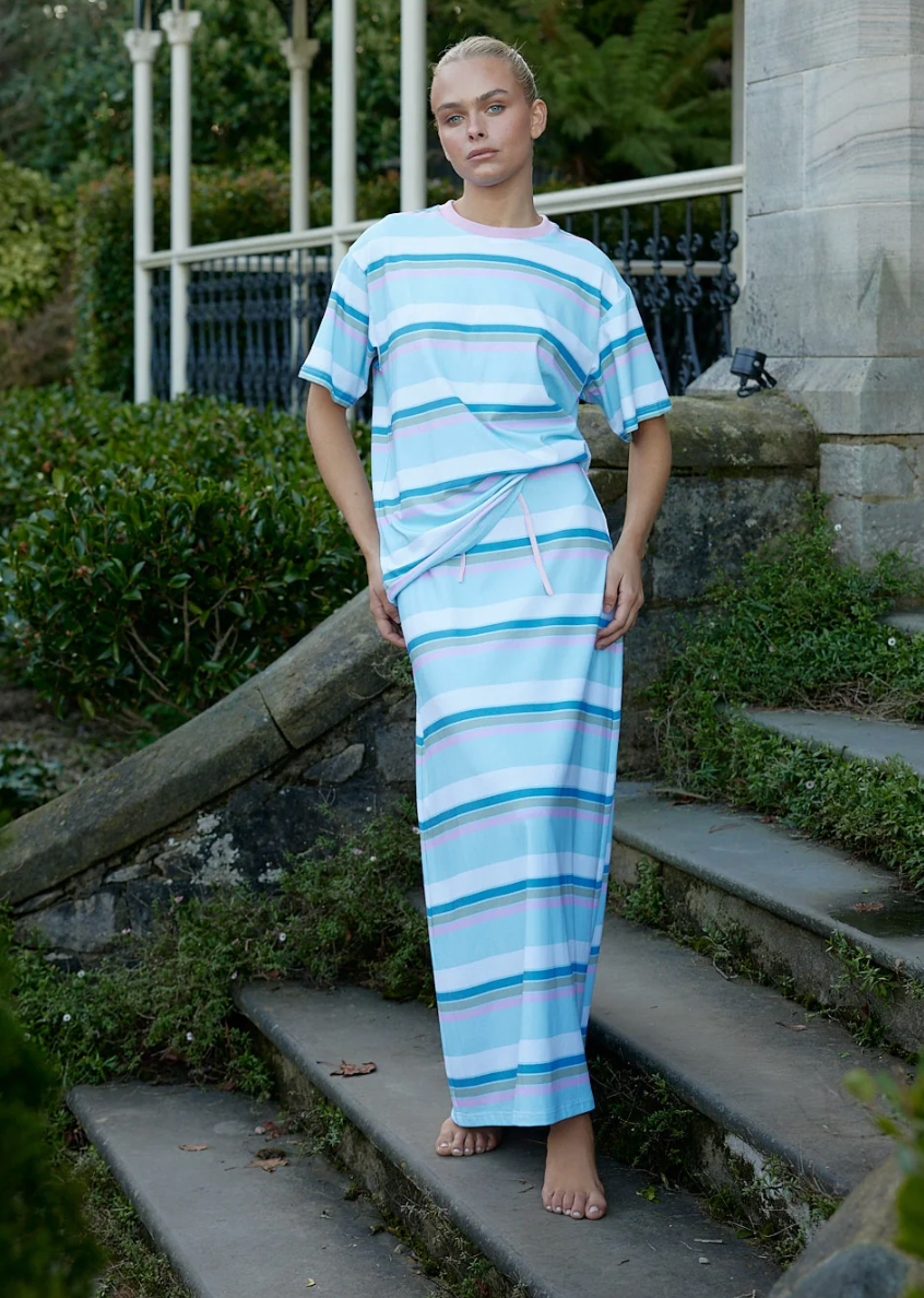 The Vida Top is a relaxed yet refined essential, crafted from soft, breathable fabric. Featuring a classic crew neckline, short sleeves, and our signature pastel stripe design, this versatile piece exudes effortless charm. Perfect for pairing with matching separates or elevating your casual wardrobe.