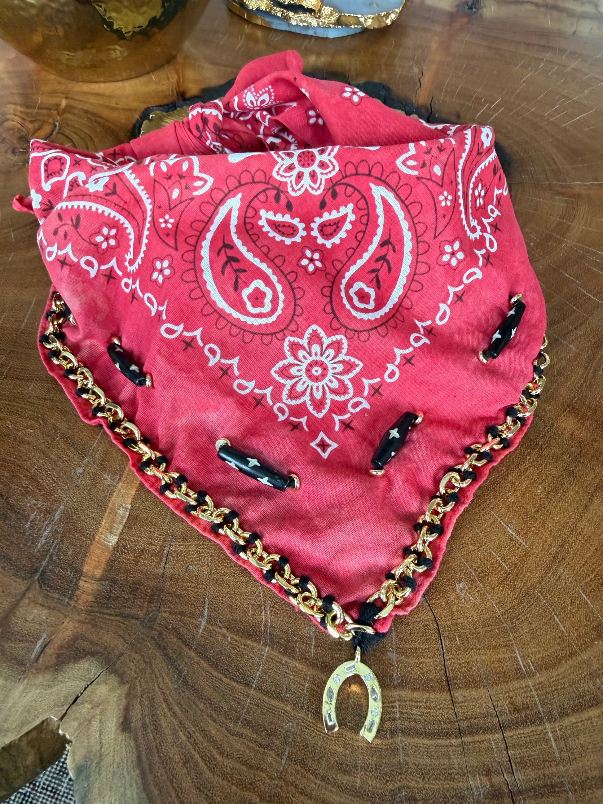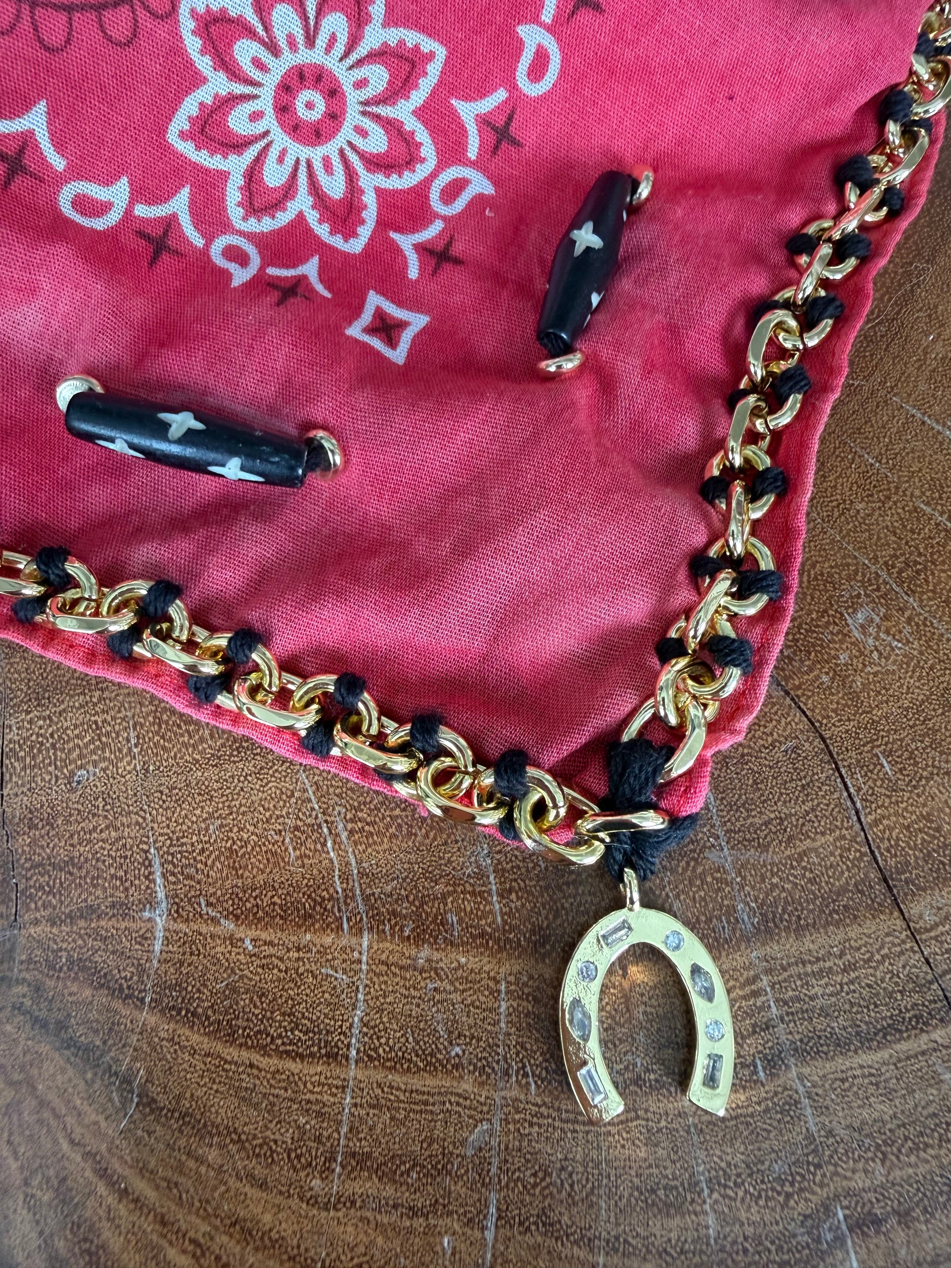 Red bandana with 18K gold filled chain, horseshoe charm, bone beads. Each piece is handmade by the designer in Aspen, Colorado. Every design is individual, unique and one of a kind- no two pieces are ever the same. The embroidery is done completely by hand reflecting the care and craftsmanship that goes into each piece.