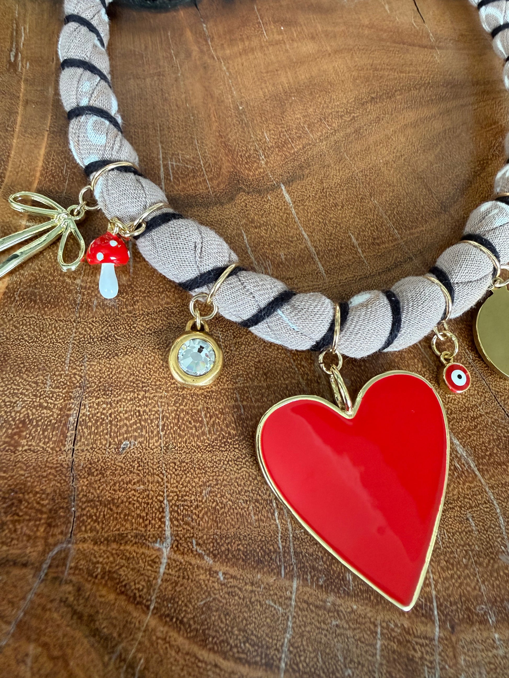 Taupe bandana with 18K gold filled red heart, bow, mushroom, crystal, cherries, eye and LOVE charms. Each piece is handmade by the designer in Aspen, Colorado. Every design is individual, unique and one of a kind- no two pieces are ever the same. The charms and chain range from 18k gold filled to vintage and all the beading and embroidery is done completely by hand reflecting the care and craftsmanship that goes into each piece.