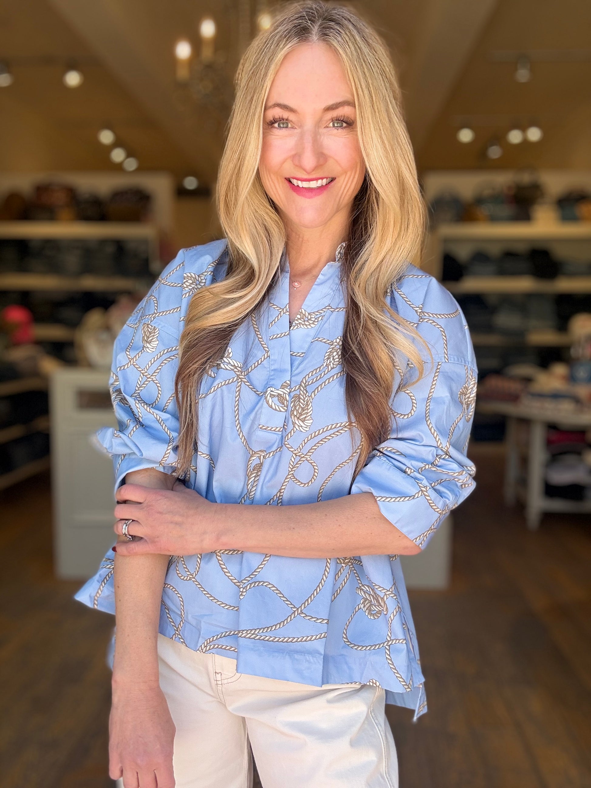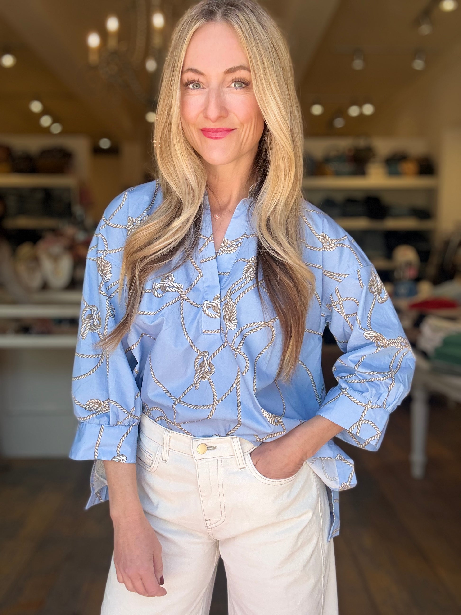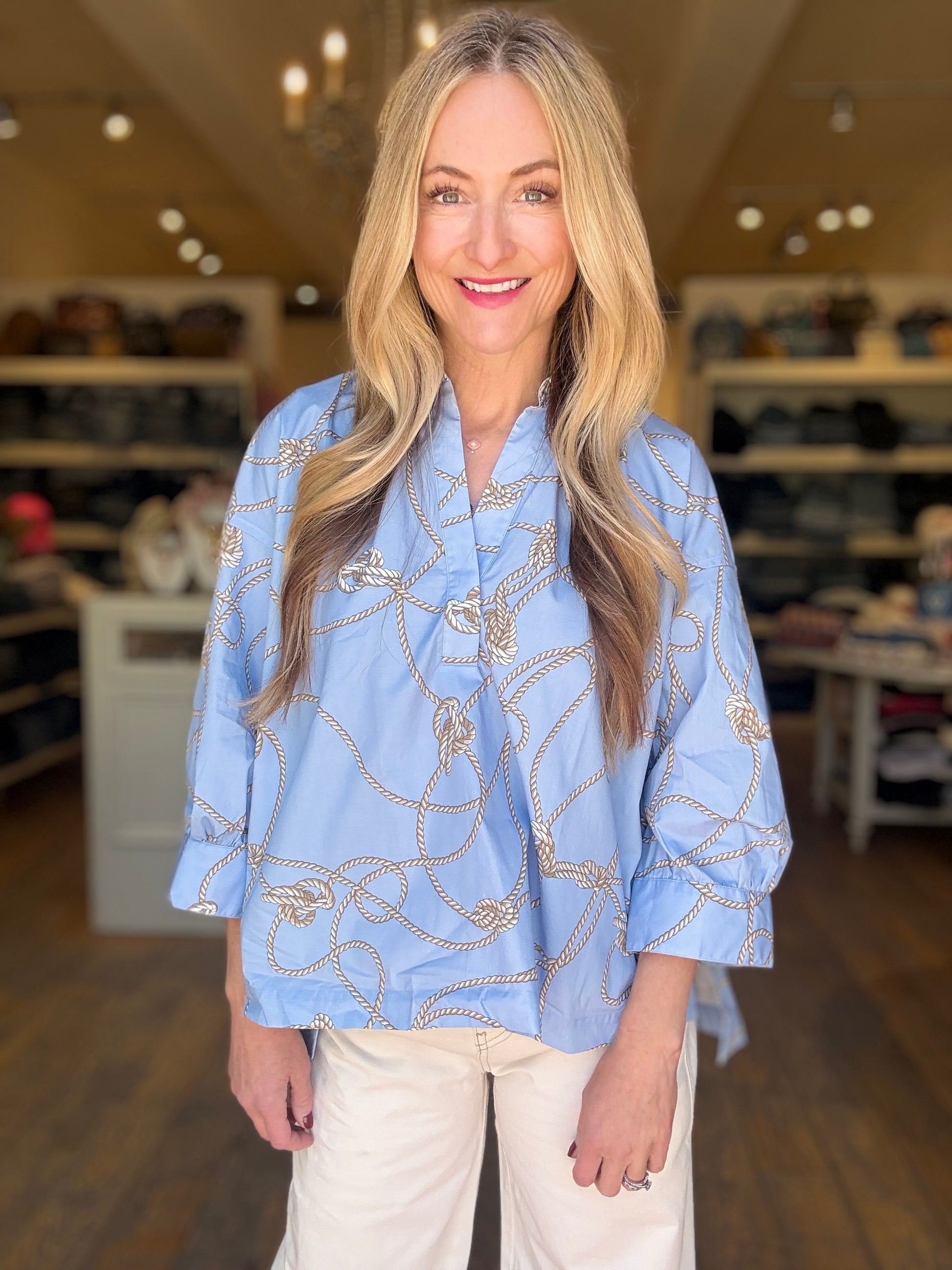 Cotton popover shirt with 3/4 blouson sleeves in light blue with rope print. Very oversized fit. Model in size 2.