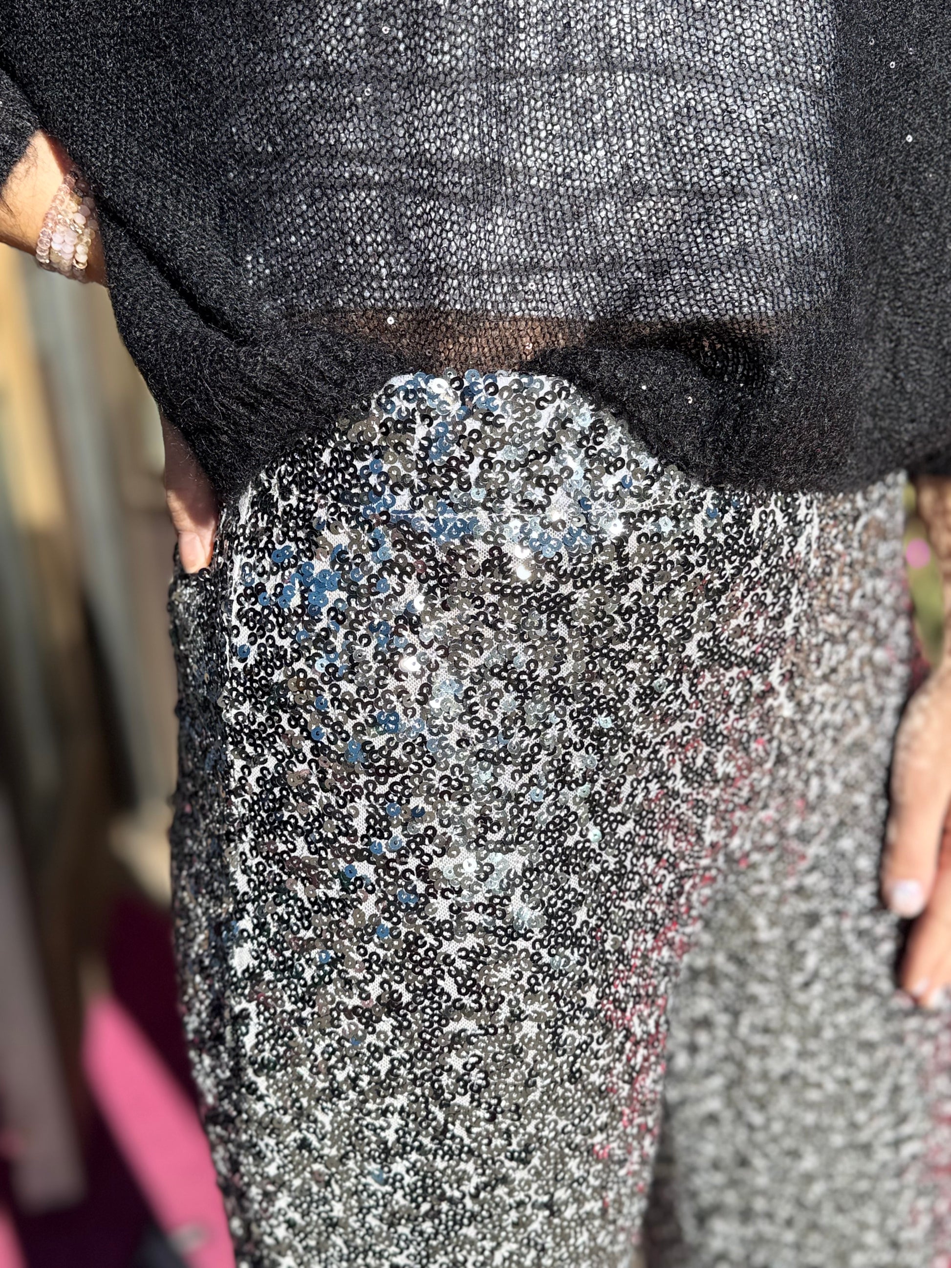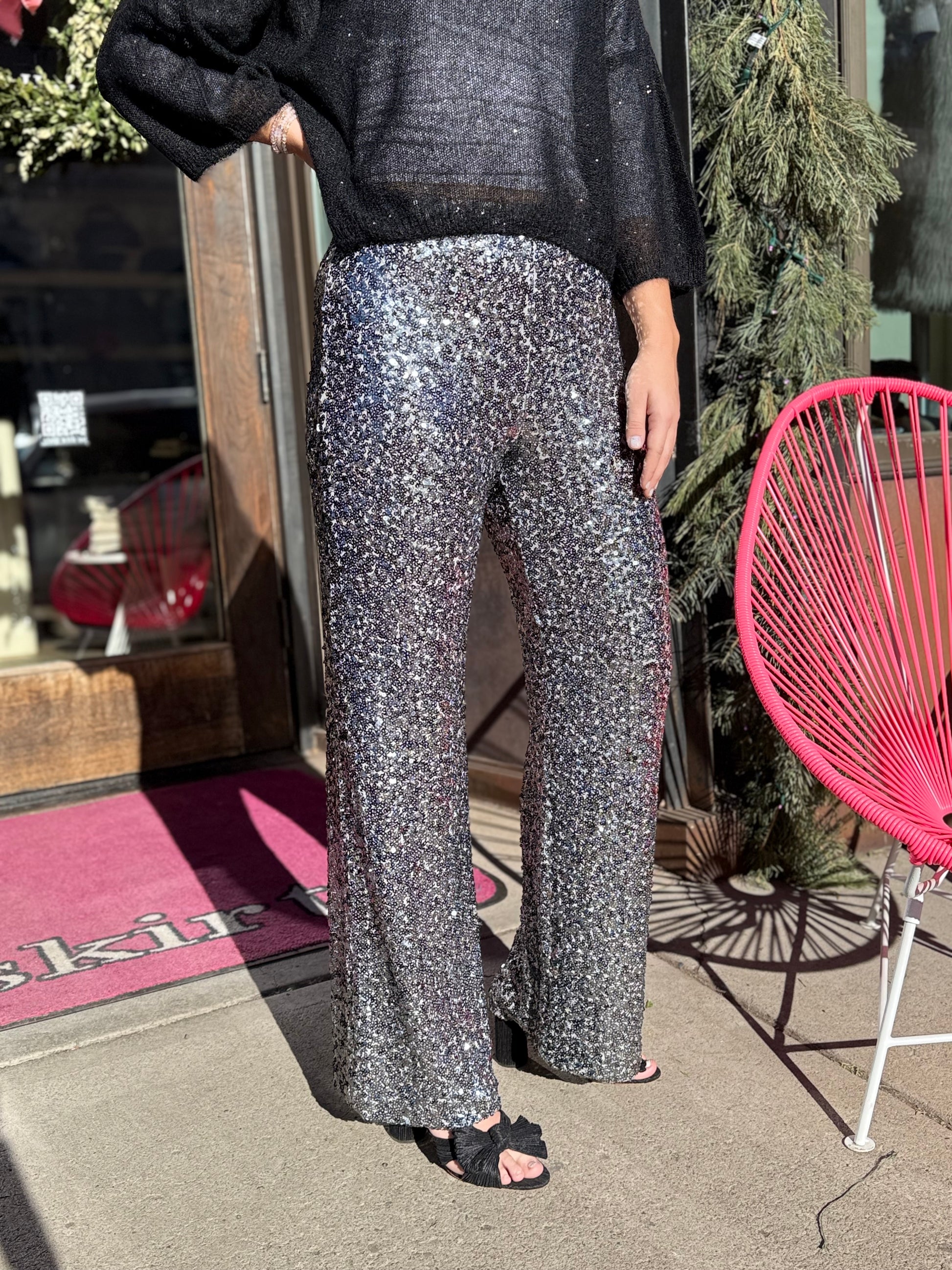 Elastic waist full length flare sparkle pant. Model in size 4.
