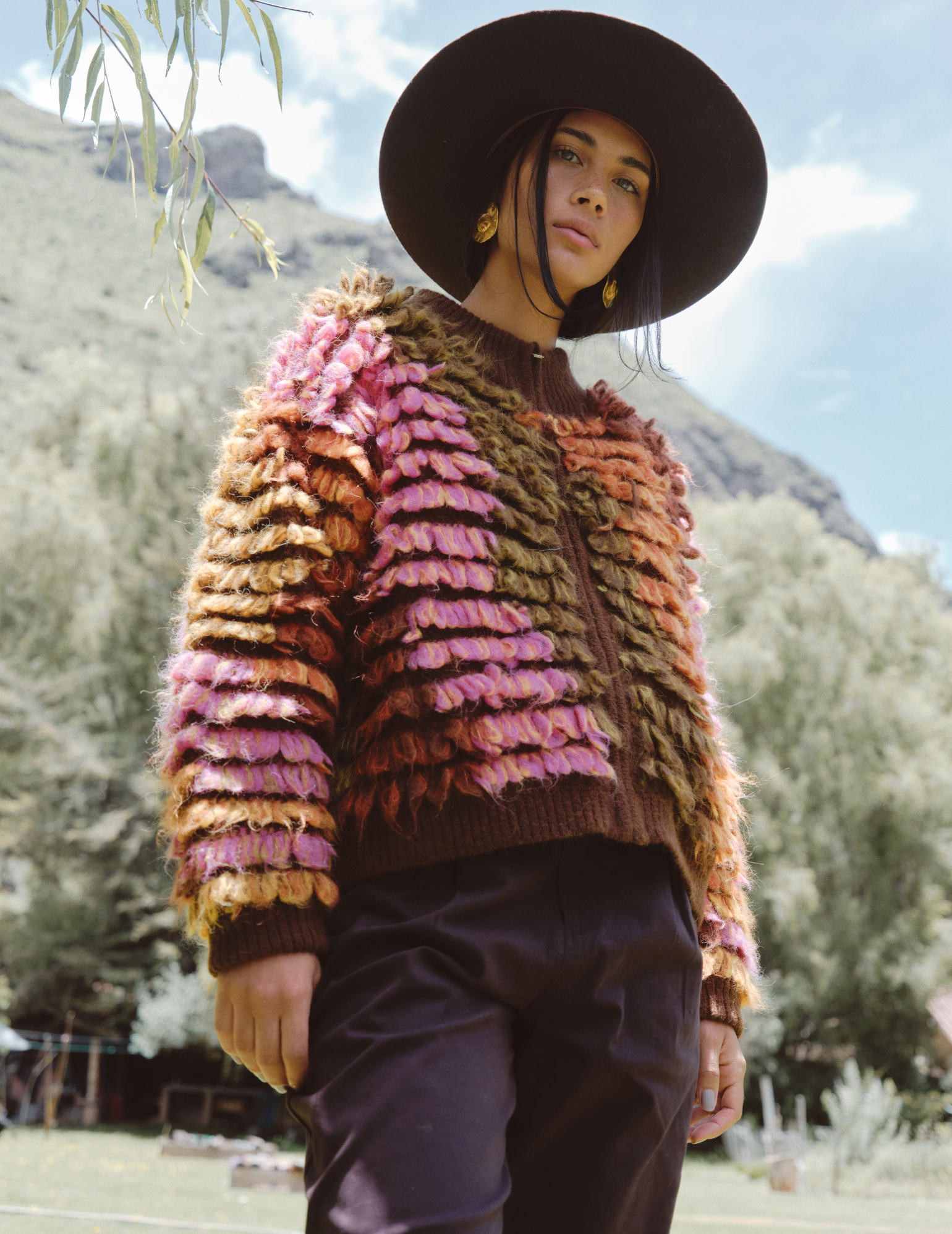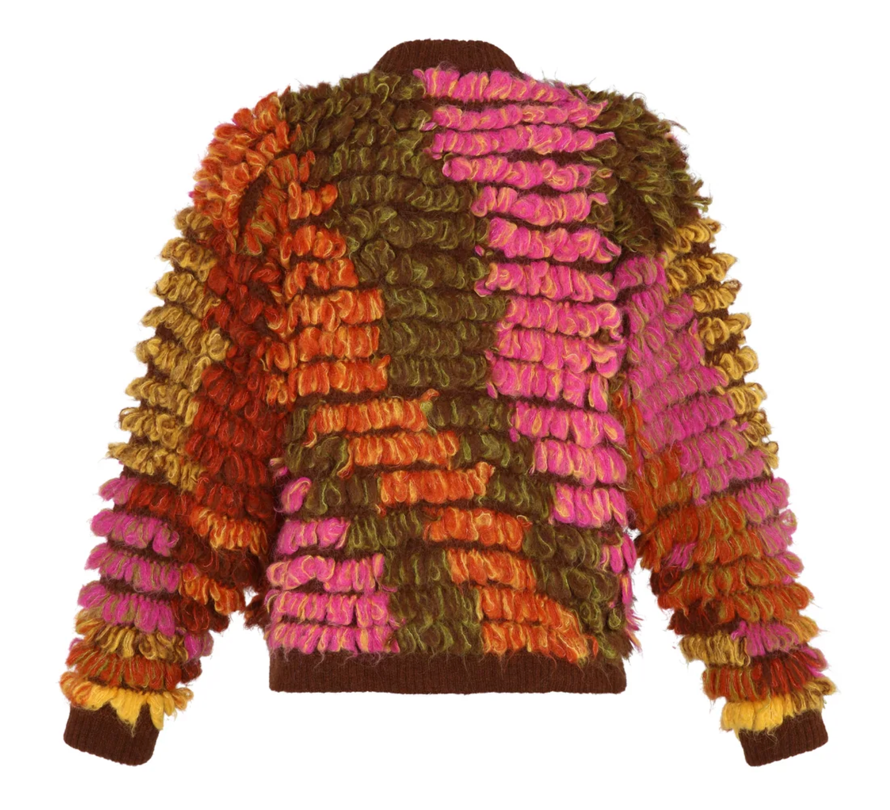 Features thick, looped yarns in a camouflage-like pattern of fuchsia, orange, mustard, and olive green on a brown base