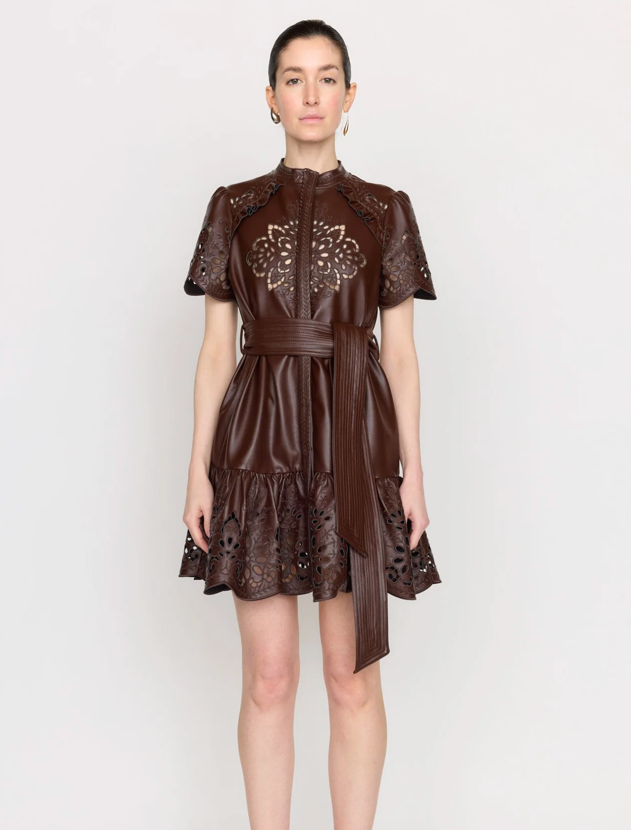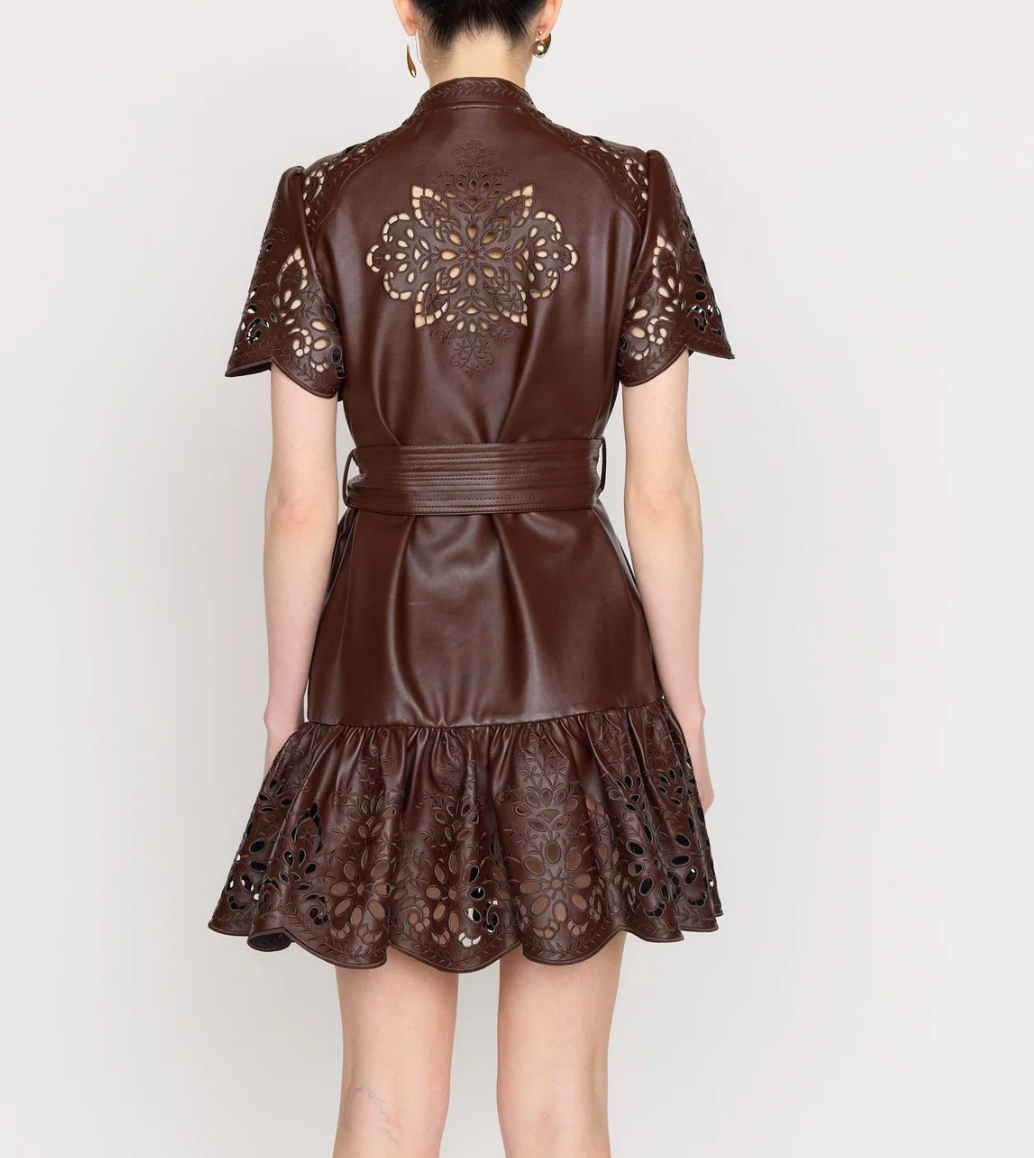 Crafted in vegan leather, the Carrie dress is a classic silhouette reimagined with modern floral embroidery. The dress has a feminine short sleeve with a drop-waist, single-tier skirt. It is complete with a trapunto-stitched self-tie belt, snap closures at the front placket, and a matching slip.