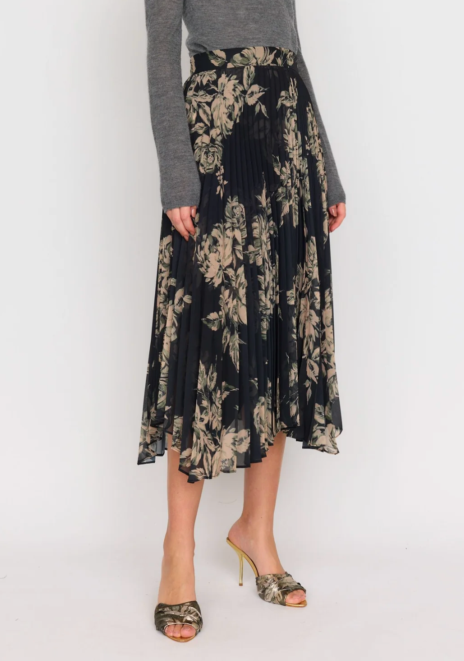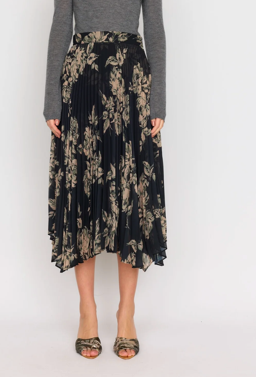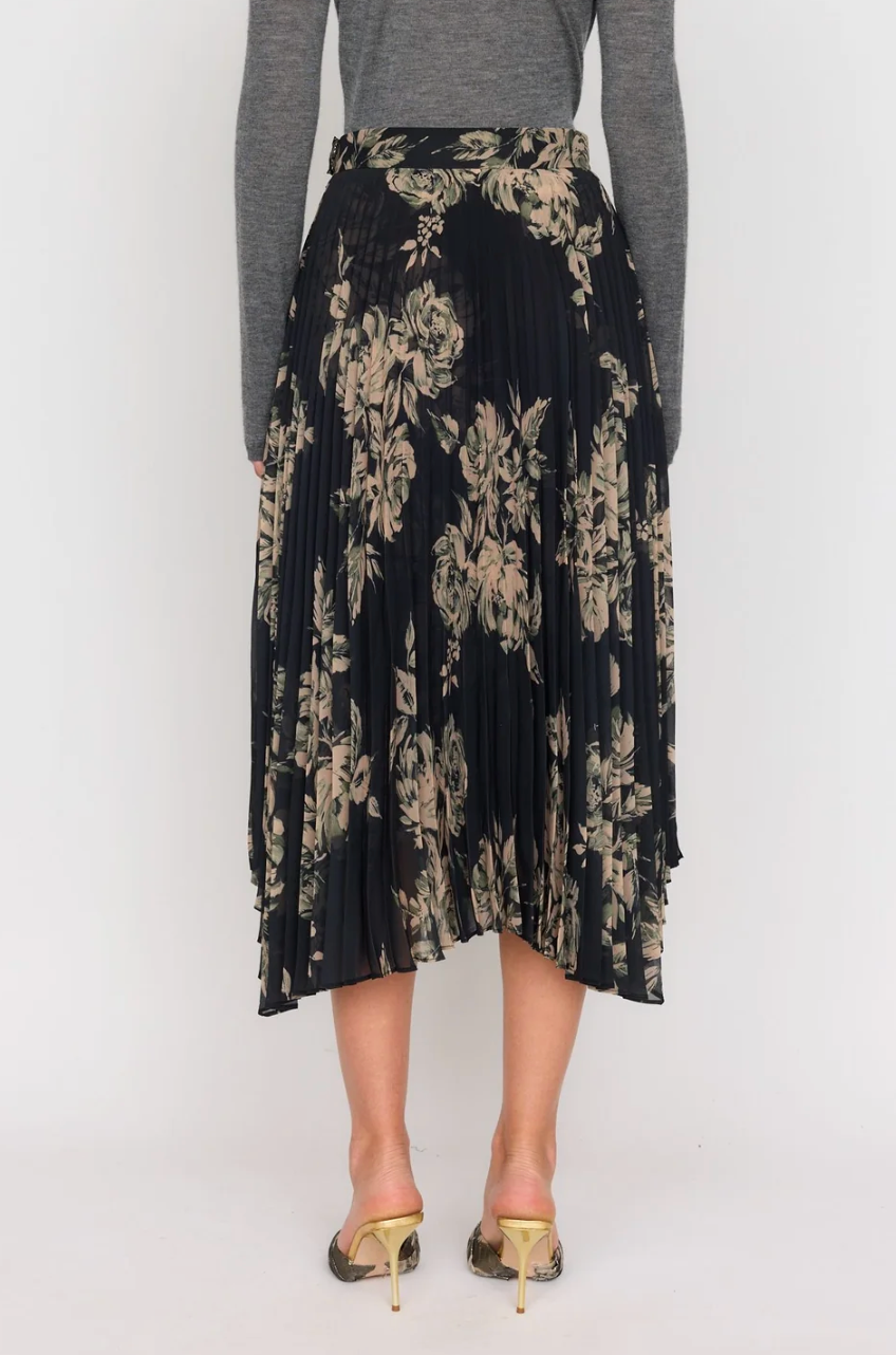Crafted with intricate pleating, the Gwen Skirt arrives in a hand painted Black Rose print. This mid-calf skirt features an asymmetrical hem that allows for a whimsical elegance and creates movement in the silhouette. It features a flat front waistband and an invisible zipper at the side seam for closure. It is finished with an attached printed lining.