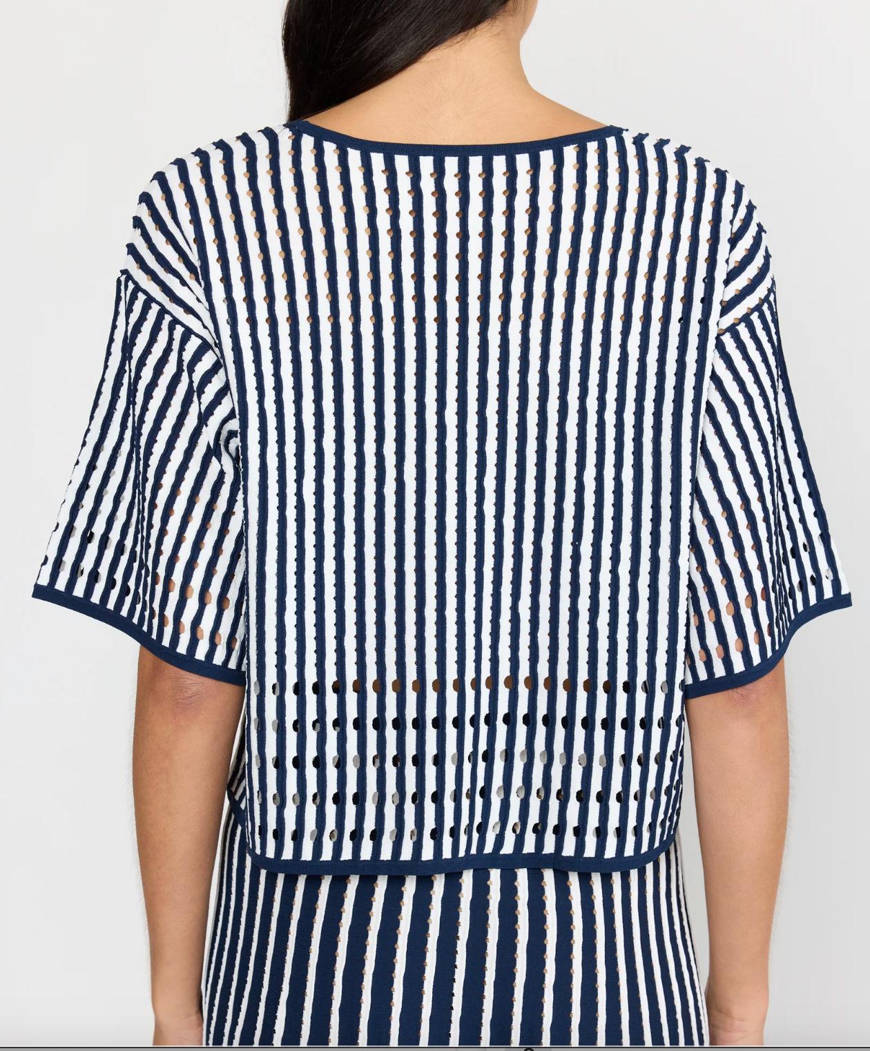 The Nellie Top in Pinstripe Navy is a modern knit essential designed with texture and ease in mind. Featuring an open-knit construction and a graphic pinstripe pattern, this short-sleeve silhouette feels both breathable and visually striking. The slightly cropped shape and relaxed proportions give it a contemporary, effortless feel.