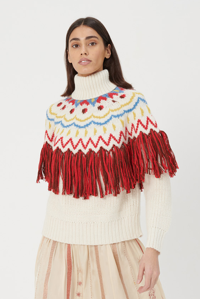 Turtle neck sweater with a pops of red, mustard yellow and blue. Fringe detail around the middle of the sweater adds a touch of fun.